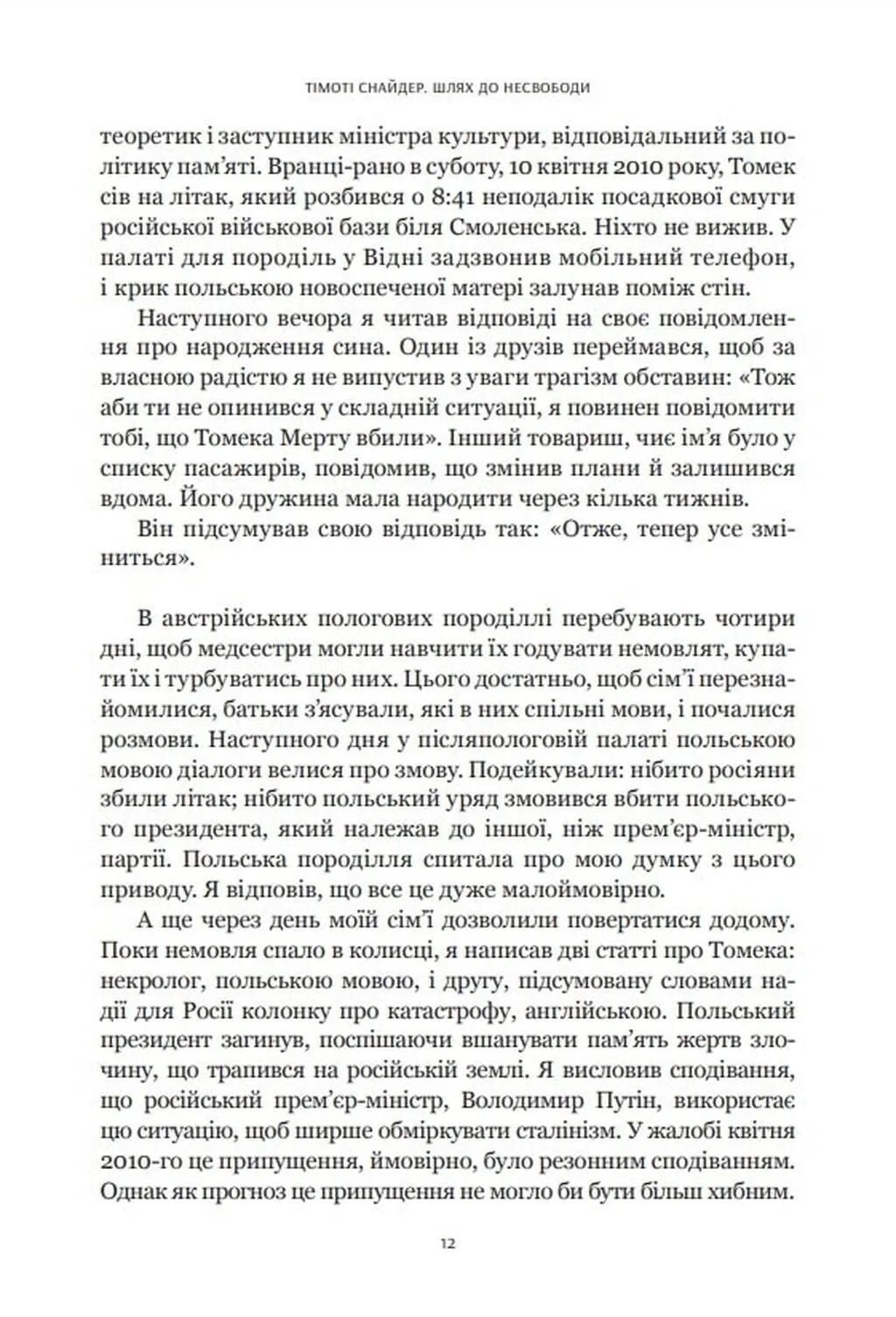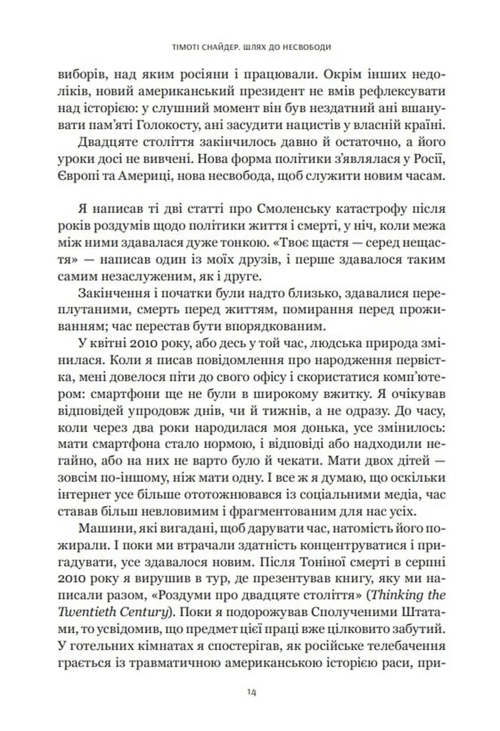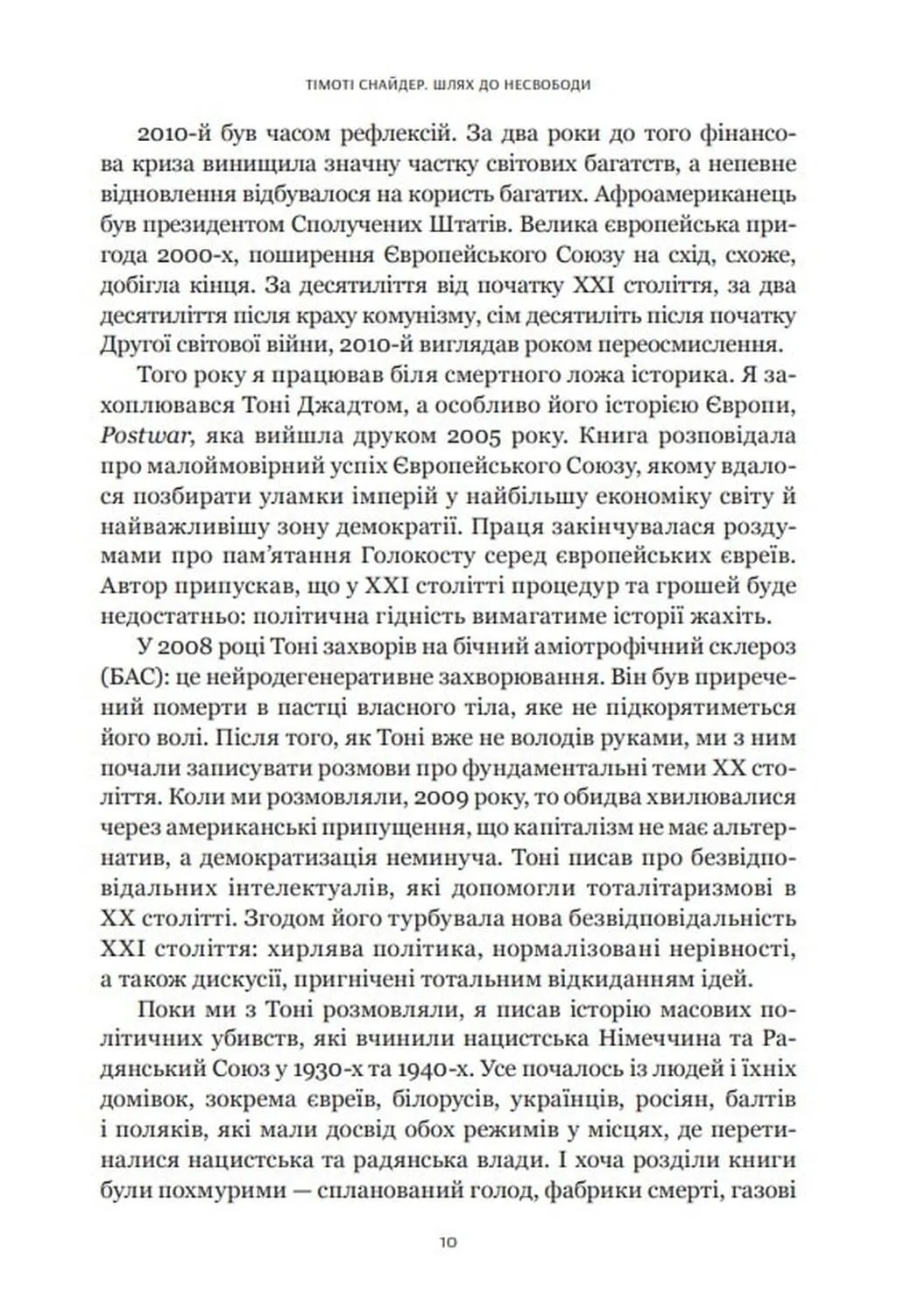 Книга Шлях до несвободи авторства Тімоті Снайдера є однією з найактуальніших праць про геополітичні зрушення 2010-х років. Вперше видана англійською мовою у 2018 році, вона не втрачає своєї актуальності й зараз, особливо для українського читача. Тімоті Снайдер, знаний американський історик і фахівець з історії Східної Європи, у своїй праці аналізує фундаментальні зміни в політиці Росії, України, США та Європи з 2011 по 2016 роки.