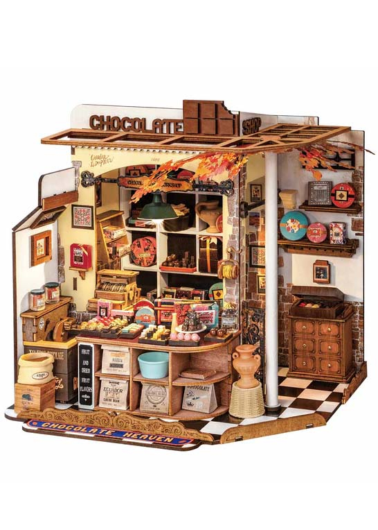 У комплекті ви знайдете 330 мініатюрних деталей, які потрібно зібрати самостійно. Серед елементів — плиткова підлога, деталізовані дерев’яні меблі, вітрини, баночки, коробки й, звісно, безліч шоколадних виробів — від праліне до традиційних плиток. Особливу атмосферу додає вбудована LED-підсвітка, яка підкреслює кожен елемент і створює враження, ніби крамниця щойно відкрилася для відвідувачів.
