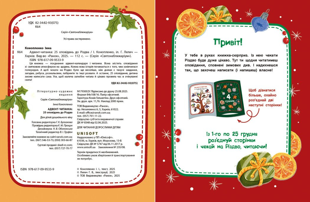 Адвент-читанка чудово підходить як подарунок для дітей віком від 4 до 10 років. Ви можете разом із дитиною створити чудову традицію — щовечора відкривати нову сторінку та насолоджуватись магією слова. Також це чудовий спосіб провести час родиною та навчити дитину цінувати свята через емоції та прості радості.