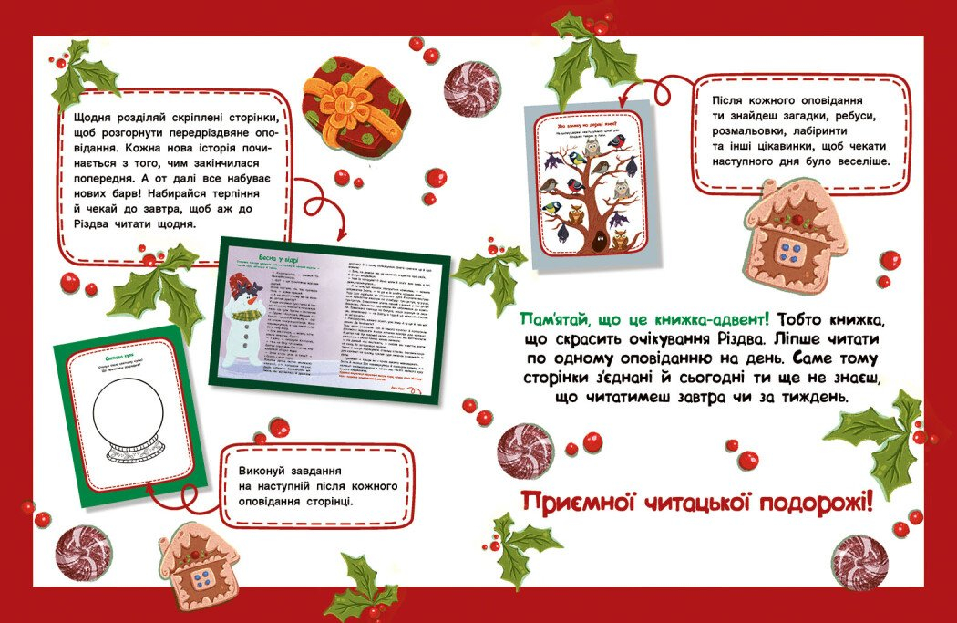Це не просто збірка новорічних історій. У книзі вміщено 25 пов'язаних між собою оповідань, кожне з яких є продовженням попереднього. Завдяки цьому дитина щодня слідкує за розвитком сюжету та з нетерпінням чекає наступної частини. Це підсилює інтерес до читання, формує звичку та дарує справжній святковий настрій.