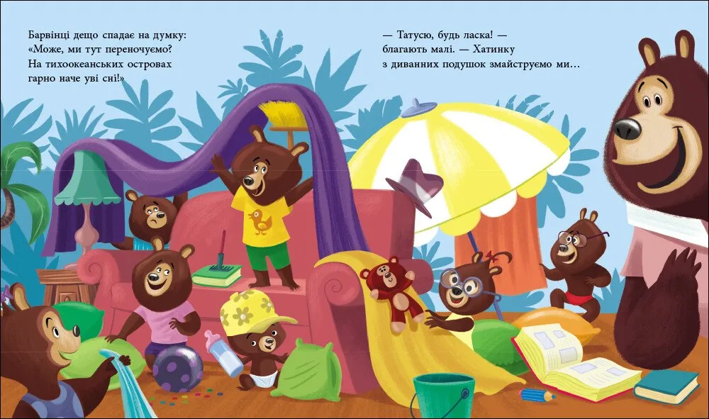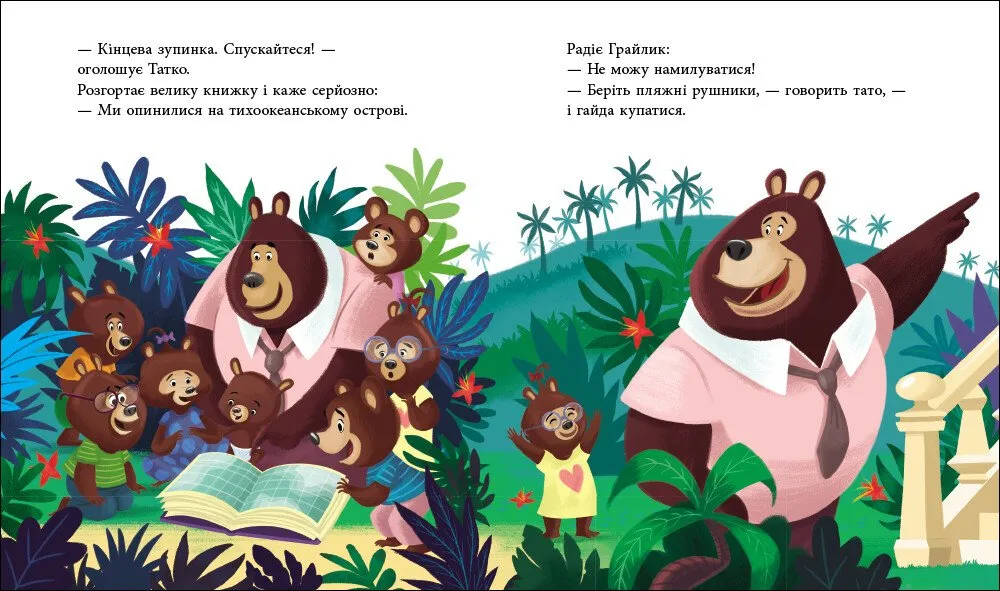Після важкого дня тато-ведмідь вирішує, що настав час відпочити. І не просто вдома, а справжнісінький відпочинок на теплому острові посеред Тихого океану. Разом зі своїми малюками вони вирушають у казкову подорож, де на них чекають смачне морозиво, купання, зорепади й багато веселощів.