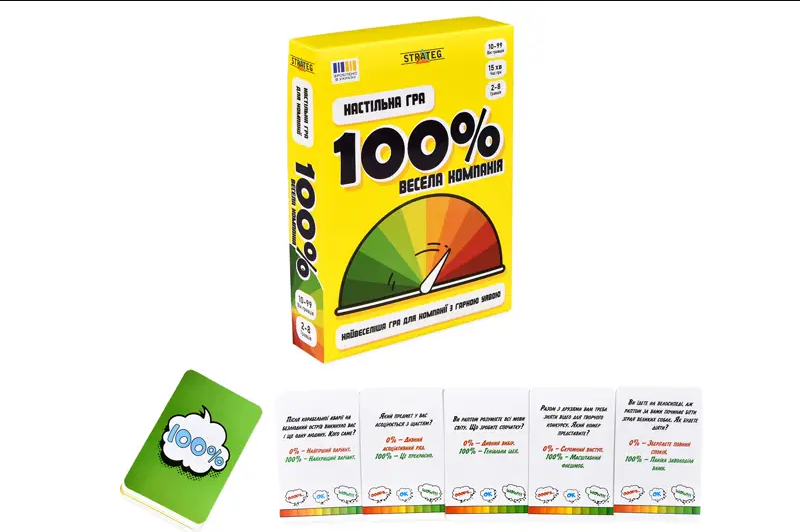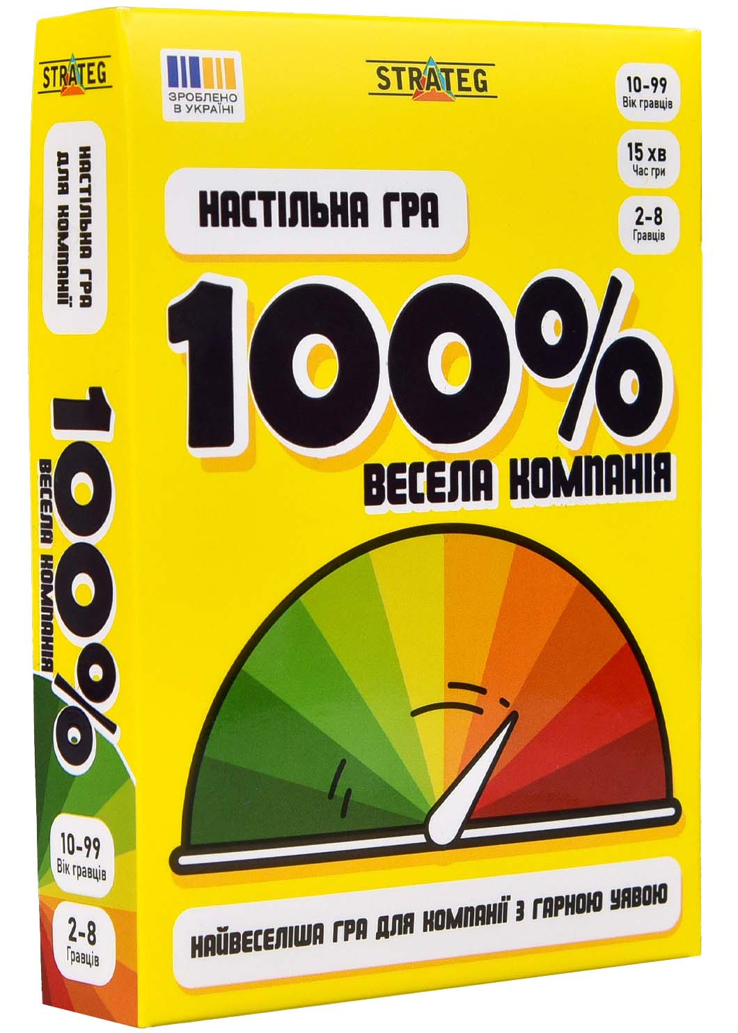 Настільна гра Strateg 100% Весела компанія — це інтерактивна та весела кооперативна гра, яка зближує гравців завдяки нестандартному способу взаємодії. Грати в неї можуть як друзі, так і родина, адже основна суть гри — порозуміння та сміх. Рекомендований вік для учасників — від 10 років.