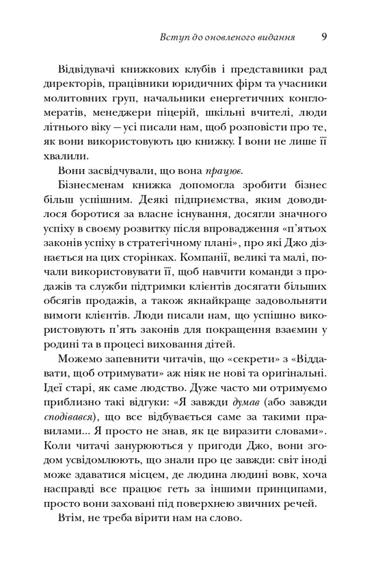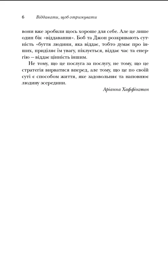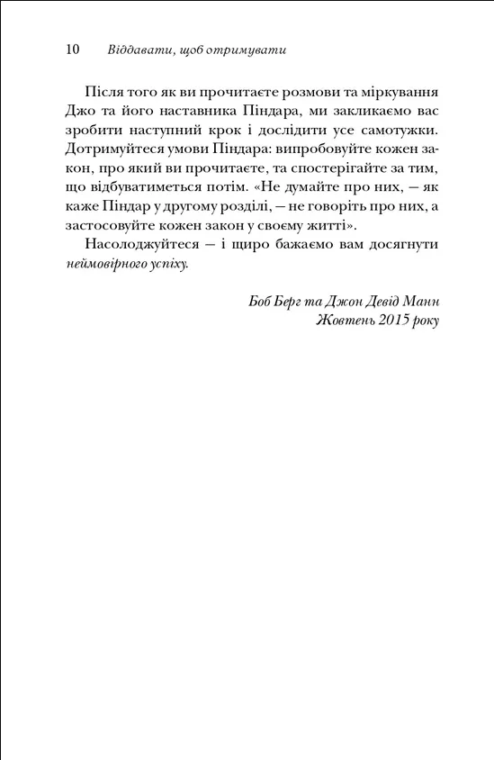 Основний меседж книги — віддавати, щоб отримати. Це означає, що найкращі результати приходять не тоді, коли ми тільки беремо, а коли щиро ділимося знаннями, енергією, часом та ресурсами. Такий підхід відкриває шлях до глибоких стосунків, довіри та стабільного професійного зростання.