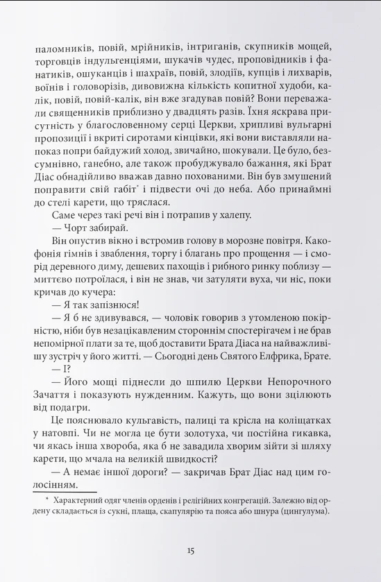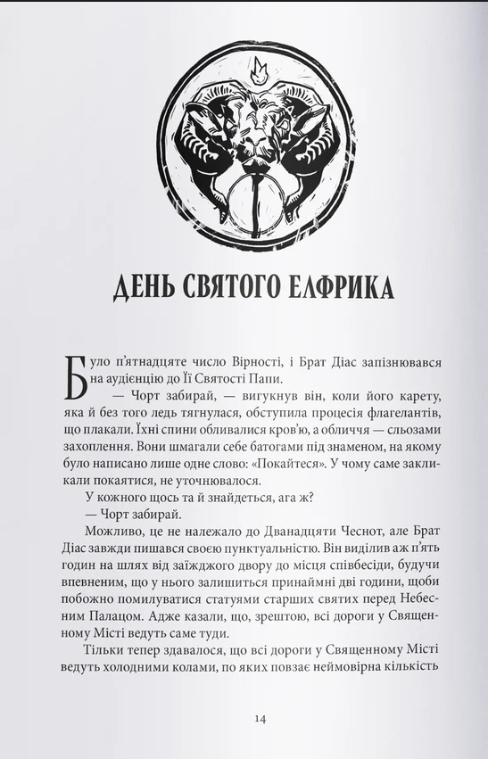 Свята справа здебільшого вимагає нечестивих вчинків — саме такою є головна тема роману. Брата Діаса викликають зі звичного орденського життя до величного Священного Міста — він впевнений, що його обрано для високої місії. Проте реальність виявляється іншою. Нова паства складається не з подвижників, а з вбивць, магів та чудовиськ, і їхня місія — просочена кров’ю та темрявою.