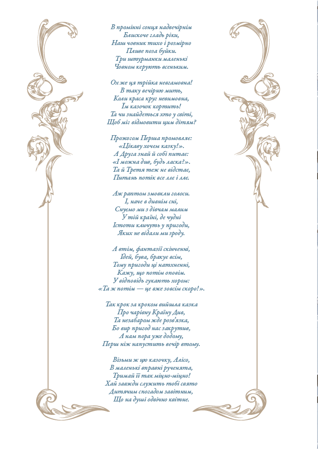 «Аліса в Країні Див» — безсмертна казкова повість Льюїса Керрола, яка протягом понад 150 років зачаровує читачів по всьому світу. Ця видатна літературна пам’ятка, перекладена десятками мов і не раз екранізована, продовжує захоплювати нові покоління дивовижними персонажами і химерними пригодами. Історія розповідає про незвичайну мандрівку дівчинки Аліси, яка потрапляє у фантастичний світ через кролячу нору. У Країні Див на неї чекають неймовірні зустрічі з незвичайними істотами, несподівані повороти сюжету та захопливі пригоди, що кидають виклик логіці та звичним уявленням про реальність.