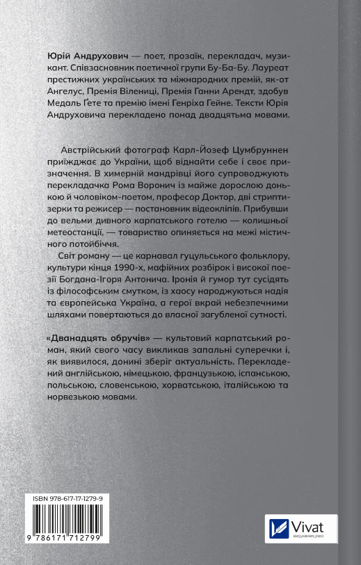 «Дванадцять обручів» — культовий карпатський роман, який свого часу викликав запальні суперечки і, як виявилося, донині зберіг актуальність. Перекладений англійською, німецькою, французькою, іспанською, польською, словенською, хорватською, італійською та норвезькою мовами.