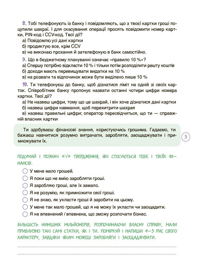 Цей робочий зошит допомагає підліткам сформувати правильне ставлення до грошей, зрозуміти важливість заощаджень, бюджетування та планування витрат. Наповнений цікавими та пізнавальними завданнями, він стимулює критичне мислення та самостійне прийняття рішень.