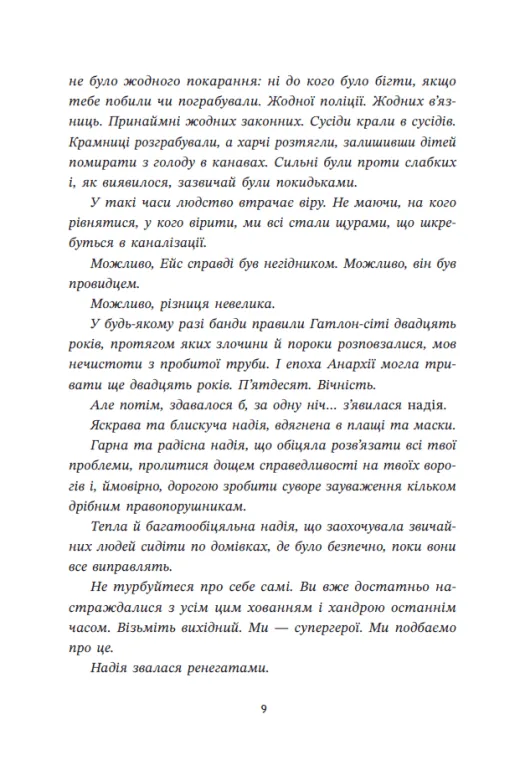 Книга Ренегати написана авторкою бестселерів Маріссою Маєр, яка добре відома своїми сміливими фантастичними сюжетами. Події відбуваються у постапокаліптичному світі, де панували злочинні банди, а суспільство впало в режим Анархії. Ситуація змінилася, коли з'явилися Ренегати — спілка людей із надзвичайними здібностями, котрі взяли на себе відповідальність встановити новий порядок.