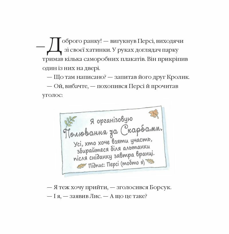 Головний герой книги, доглядач парку на ім’я Персі, влаштовує незвичайне змагання для своїх лісових друзів — гру у пошуки скарбу. Щоб перемогти, звірятам необхідно уважно слідувати підказкам, розгадувати загадки та проявляти наполегливість.