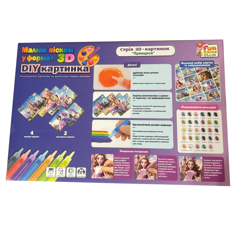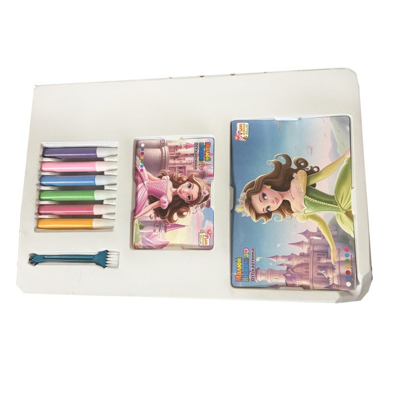 Цей креативний набір подарує вашій дитині новий, захопливий досвід малювання. Замість звичних олівців чи фарб, маленькі художники зможуть створювати шедеври за допомогою різнокольорового піску.