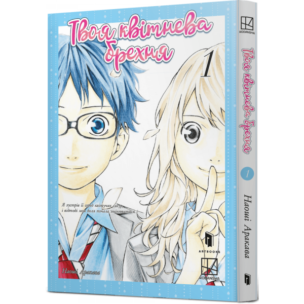 Я зустрів її серед квітучих сакур, і відтоді моя доля почала змінюватися... Косей Аріма мав справжній хист до музики, та коли мати-наставниця раптово померла, його життя назавжди змінилося. Змушений покинути гру на фортепіано, хлопець опинився в монотонному, безбарвному світі та змирився із прісним буденням. Але одного дня він зустрічає Каорі Міядзоно - скрипальку з неординарним стилем. Чи зможе вона повернути Косея до музики, а з нею і до життя? Романтична янґедалт-манґа Наоші Аракави. Це життєствердна історія про дорослішання та віднайдення свого місця у світі. Чому варто читати: Зворушлива музична драма, яка стала аніме-хітом! У 2013 році ця манґа була нагороджена на 37-ій премії Kodansha Manga Award у категорії шьонен. До червня 2017 року наклад Твоєї квітневої брехні перевищив 5 мільйонів примірників.