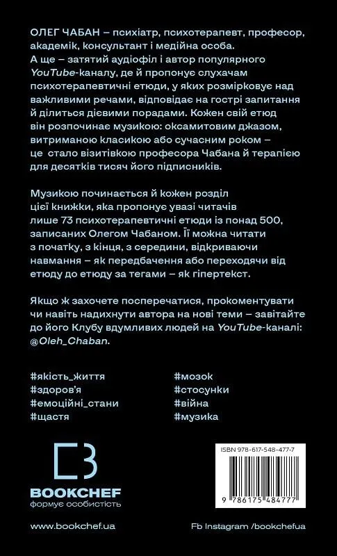 Книга Психотерапевтичні етюди — це новий авторський проєкт відомого психіатра, психотерапевта та професора Олега Чабана. Видання є друкованим продовженням і доповненням популярного однойменного YouTube-циклу, який зібрав широку аудиторію слухачів. Тепер надихаючі тексти отримали нове життя — на папері, у вашому осмисленні та власному прочитанні.