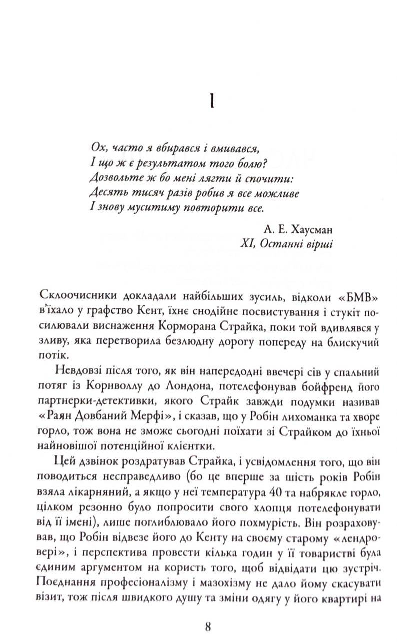 Цей етап історії Робіна та Корморана — один із найскладніших і напружених. Неймовірна атмосфера, яскраві персонажі та професійне розслідування роблять роман вартим уваги.