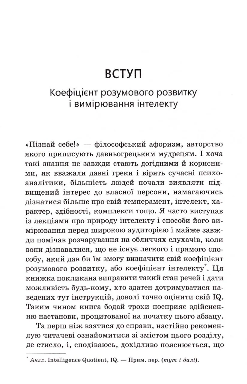 Якщо ви цікавитесь психологією, тестами або прагнете краще зрозуміти себе — ця книга неодмінно стане у пригоді. Вона підійде як молоді, так і дорослим читачам, які хочуть отримати об'єктивну картину рівня інтелекту.
