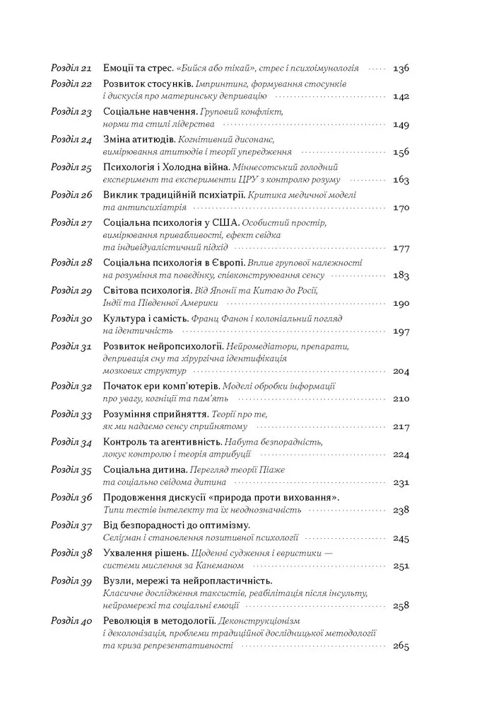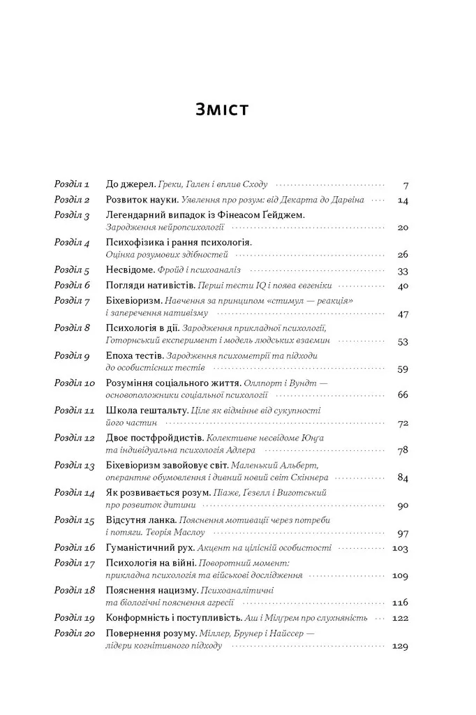 У 40 динамічних і логічно структурованих розділах авторка знайомить читача з видатними особистостями, революційними теоріями та експериментами, які сформували сучасну психологію. Від Платона і Арістотеля до сучасних нейропсихологів, від психоаналітичних ідей Фройда до наукових підходів Деніеля Канемана — кожен розділ відкриває новий горизонт в розумінні людської свідомості.
