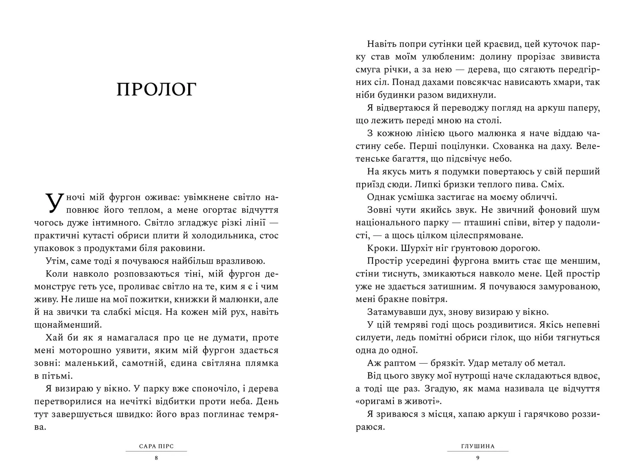 Фінальна частина трилогії про детективку Елін Ворнер — Глушина — розкриває перед читачем нову порцію напруги, небезпеки та загадкових подій у диких просторах португальського Національного парку. Авторка Сара Пірс майстерно завершила серію трилерів, серед яких відомими бестселерами стали Санаторій і Ретрит.