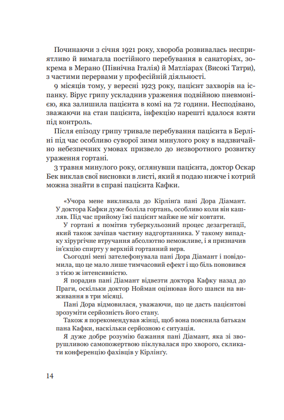 «Убий мене, або ти вбивця». Це були останні слова Франца Кафки, коли він благав Роберта Клопштока, свого приятеля, студента-медика, про чергову дозу морфію. Біля ліжка сиділа його супутниця Дора Діамант. А Оттла, улюблена сестра, чекала в Празі на новини. Роберт, Дора, Оттла — це неймовірна історія трьох ключових постатей у житті Кафки, на долях котрих позначився вплив геніального письменника. Роберт став видатним фтизіатром у Нью-Йорку. Дора пережила нацистські, а потім сталінські репресії й донесла до нас пам’ять про Кафку. А Оттла супроводжувала групу єврейських дітей до газових камер після святкування шістдесятиріччя з дня народження свого брата в таборі Терезієнштадт.