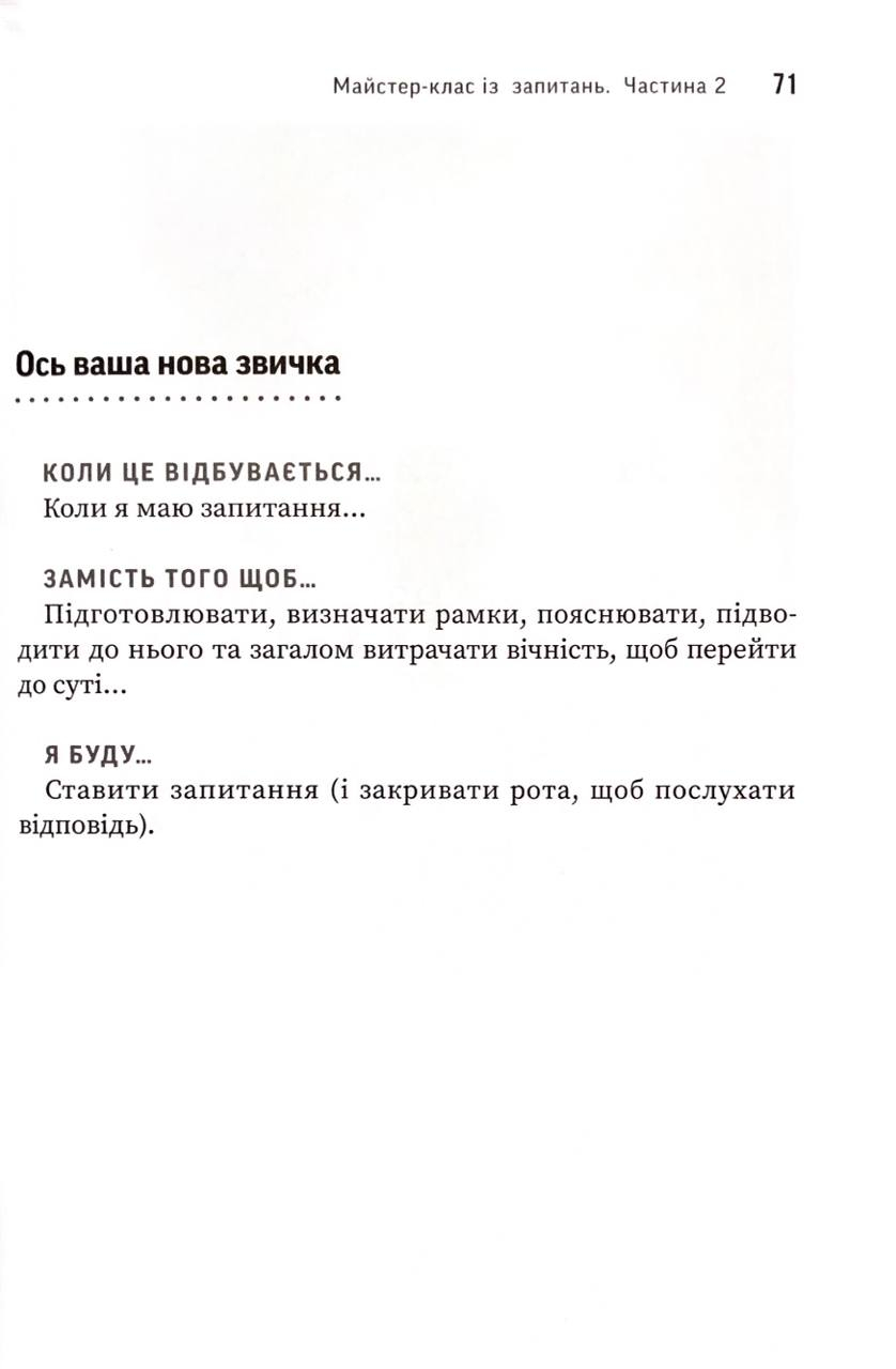 Книга Навички коучингу. Говори менше, питай більше й назавжди зміни стиль свого лідерства — це практичний путівник для бізнес-лідерів, менеджерів, HR-фахівців і всіх, хто прагне покращити комунікацію в команді, розвивати її потенціал та будувати стосунки довіри. Основна ідея — говорити менше, запитувати більше та допомагати іншим знаходити власні відповіді. Це створює сильнішу, більш ініціативну команду та звільняє ресурс керівника для стратегічних завдань.