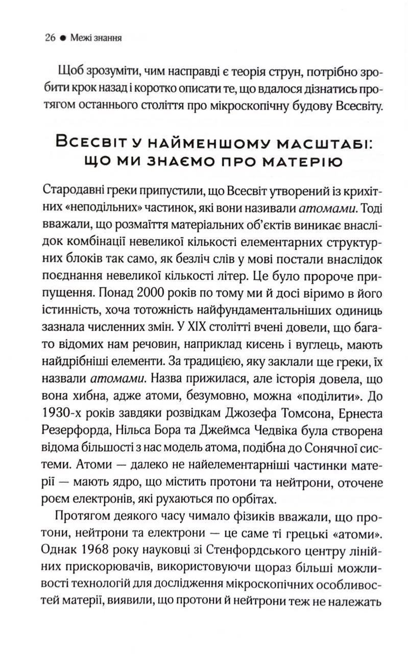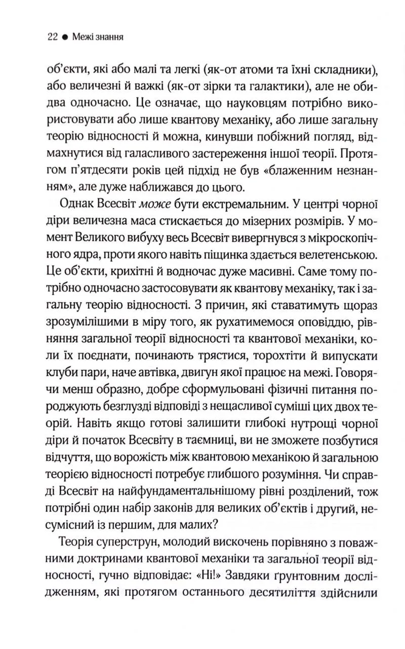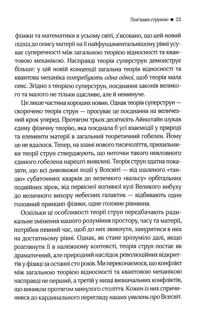 Фізика, як виявляється, може бути захопливою і переносити нас у неймовірні простори багатовимірного Всесвіту. Зараз, коли світ змінюють відкриття у сфері квантової інформації, космічного дослідження та теорії великого об’єднання, книга Браяна Ґріна не втрачає актуальності.