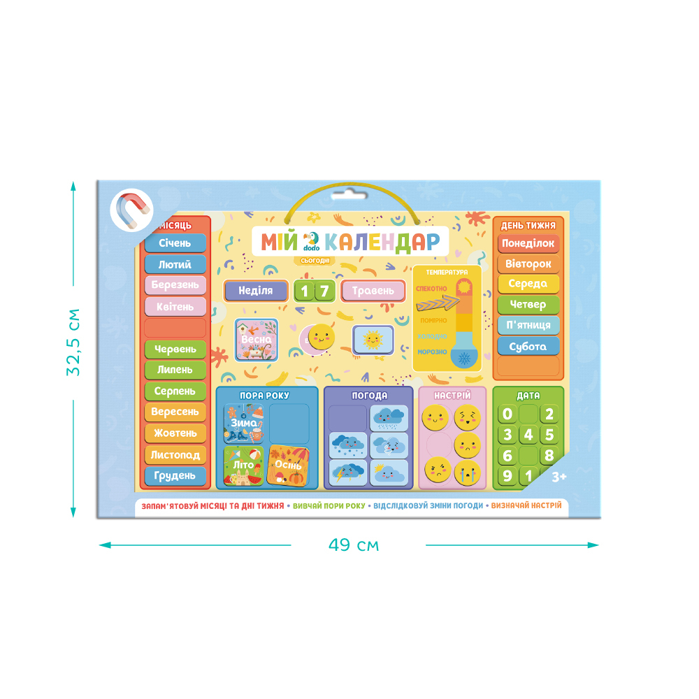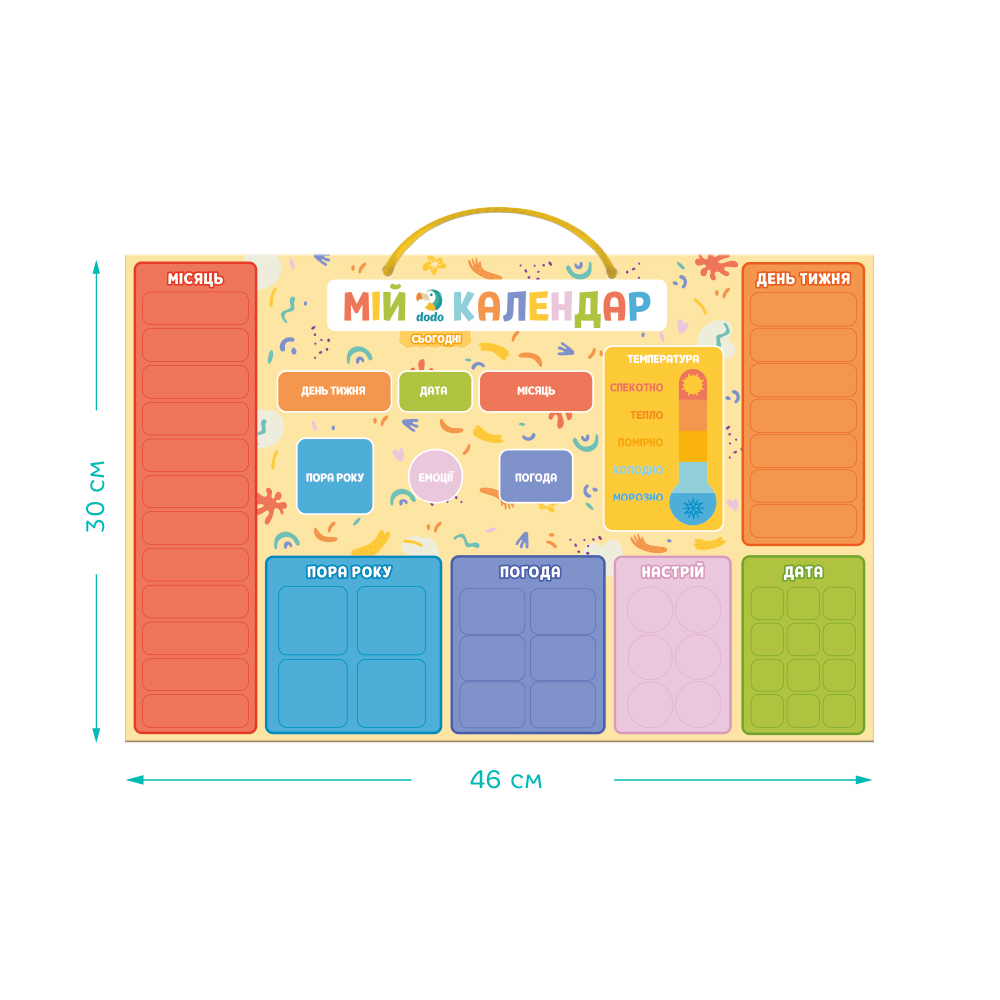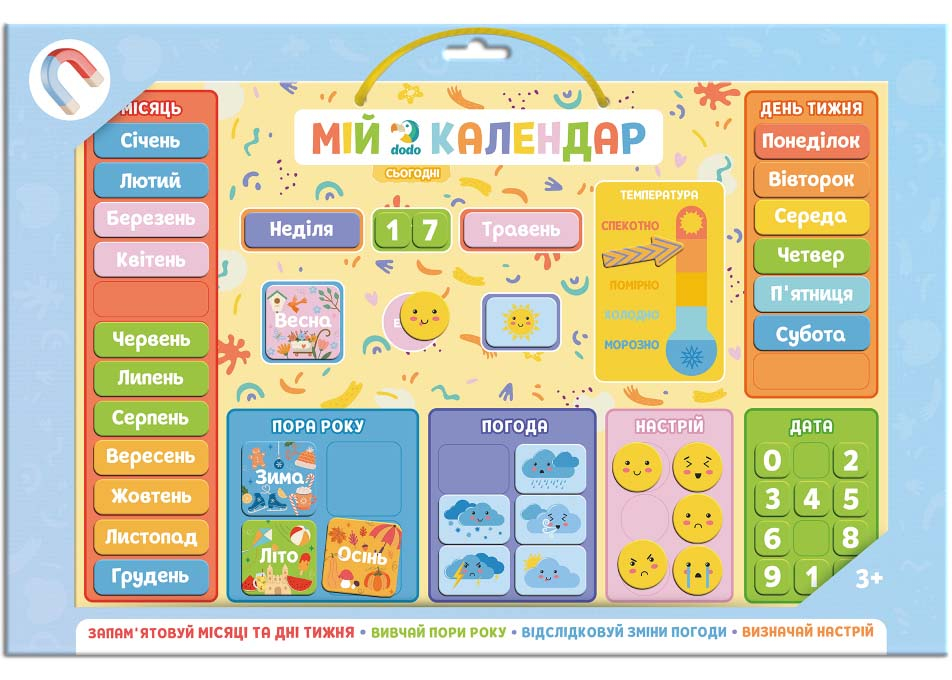 Магнітний календар Мій Dodo календар — це яскравий навчальний набір, який допомагає дітям пізнавати світ часу, природи та власних емоцій у захопливій ігровій формі. Разом із кольоровими магнітами дитина легко вивчає дні тижня, місяці, пори року, погоду, температуру та настрій.