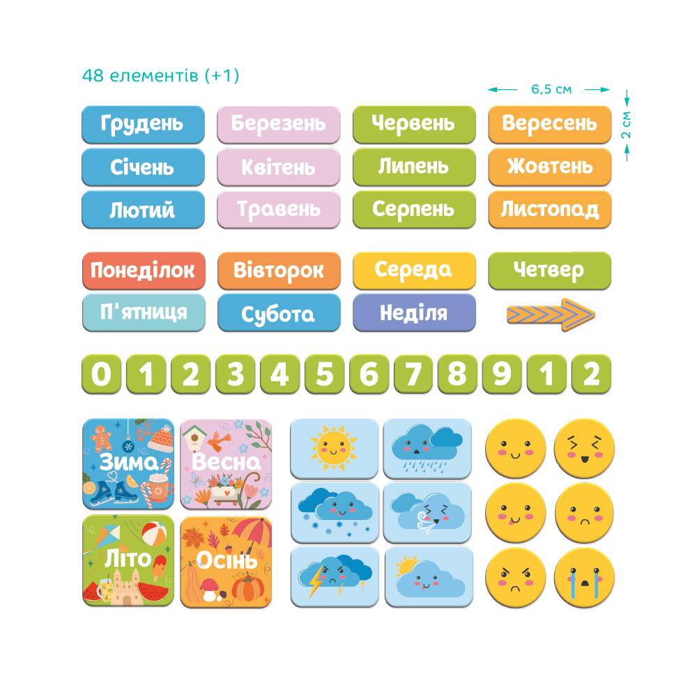 - 48 магнітів із назвами місяців, днів тижня, чисел, сезонів, погоди, температури та настрою.
