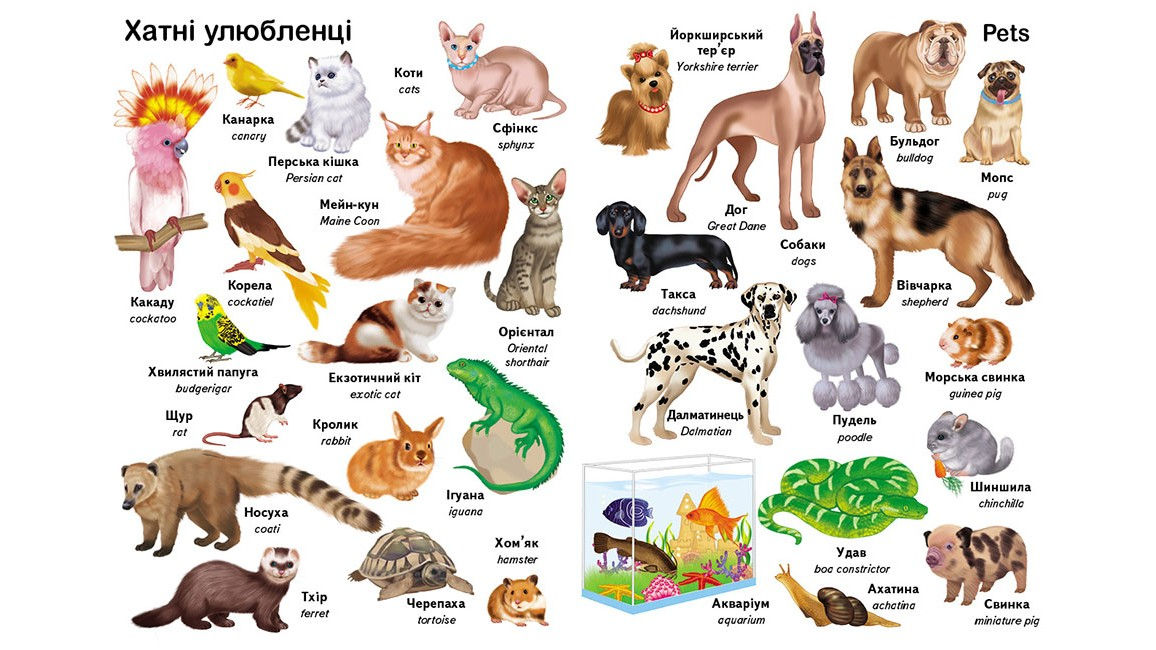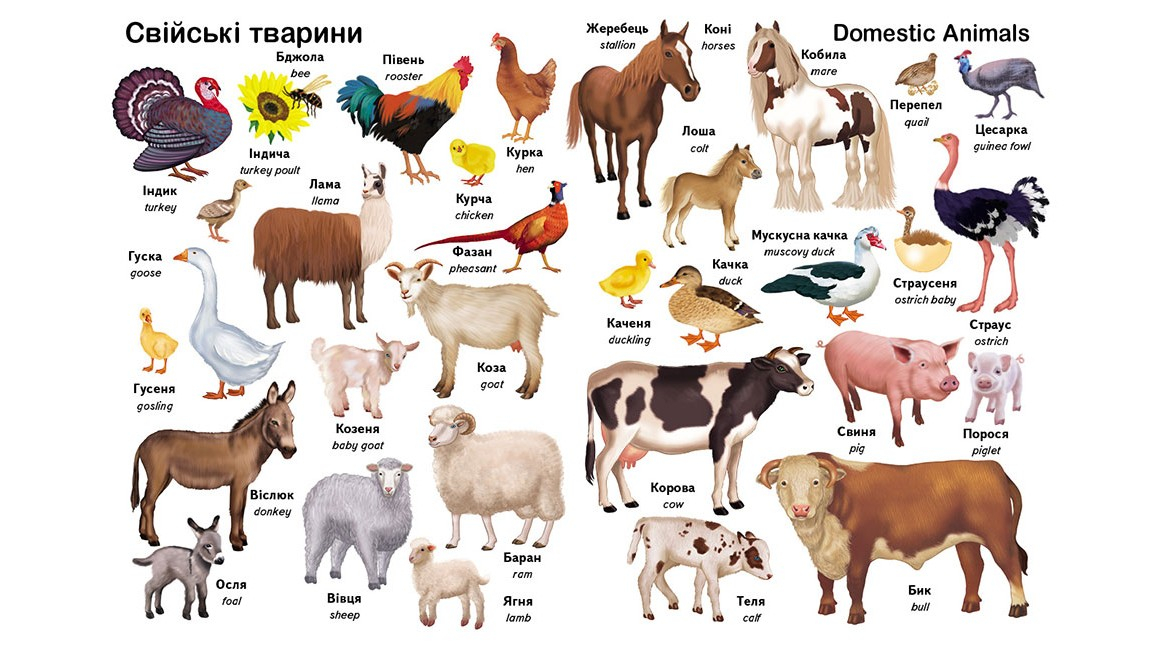 - Свійські та домашні тварини – кішка, собака, корова, кінь та інші.