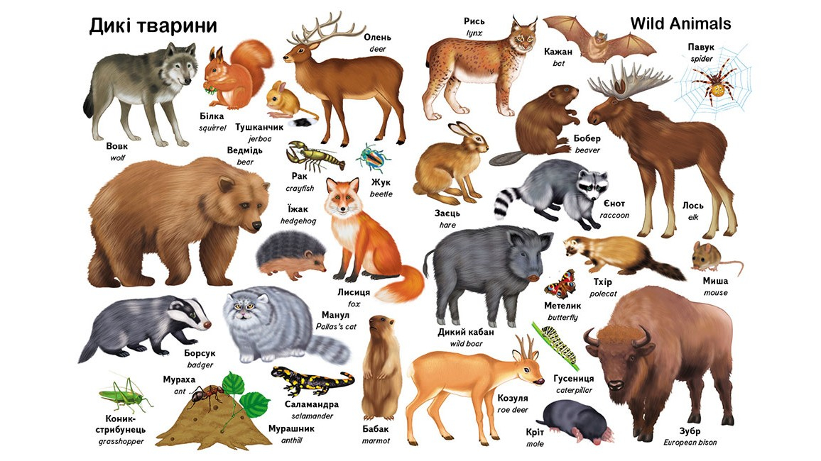 - Дикі тварини – рись, ведмідь, вовк, олень та інші мешканці лісів та джунглів.