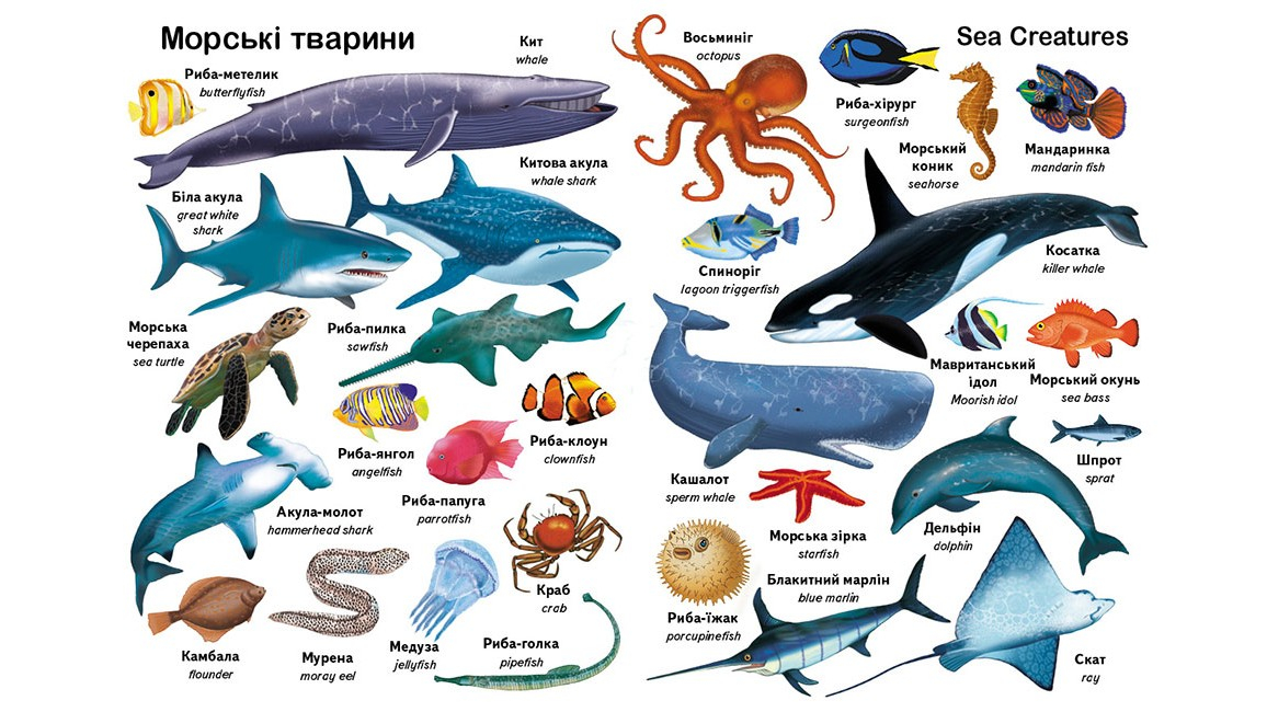 - Морські тварини – риби, дельфіни, акули та інші мешканці океану.