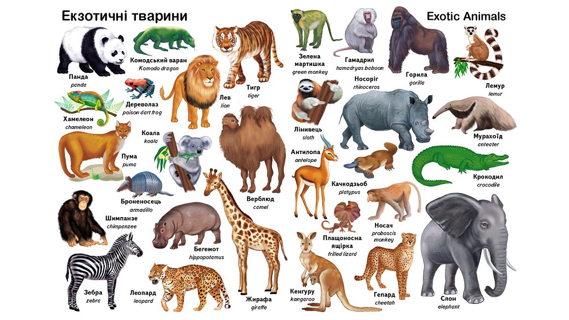 - Екзотичні тварини – слони, жирафи, зебри та інші незвичні представники тваринного світу.