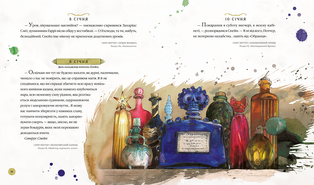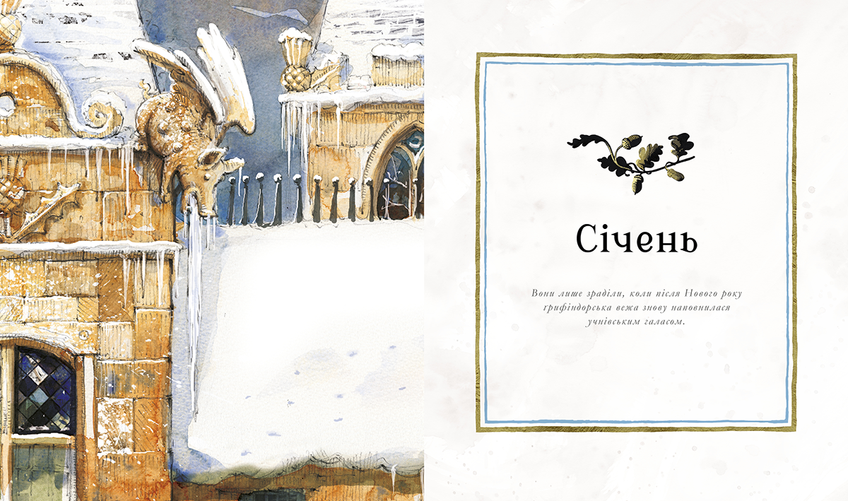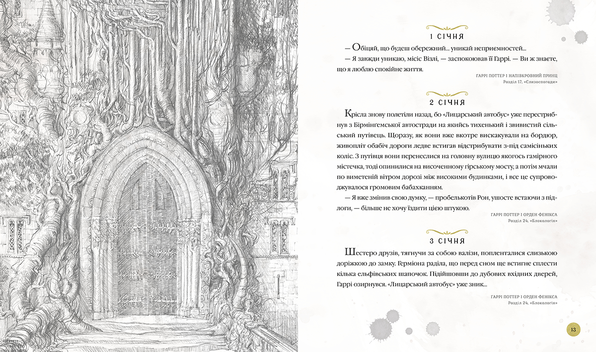 Ілюстровані Джимом Кеєм видання улюблених романів Дж.К. Ролінґ про Гаррі Поттера зачарували ціле покоління читачів. У цій пречудовій книзі зібрані його легендарні ілюстрації — включно з досі непублікованими підготовчими ескізами й малюнками — у поєднанні з 366-ма незабутніми цитатами з цієї серії. Спостерігайте, як змінюються пори року, святкуйте річниці і знову зустрічайте улюблених героїв під мальовничий акомпанемент неперевершених мистецьких чарів Джима Кея, що вичакловує магічний рік у Гоґвортсі за допомогою фарб, олівця та пікселів.