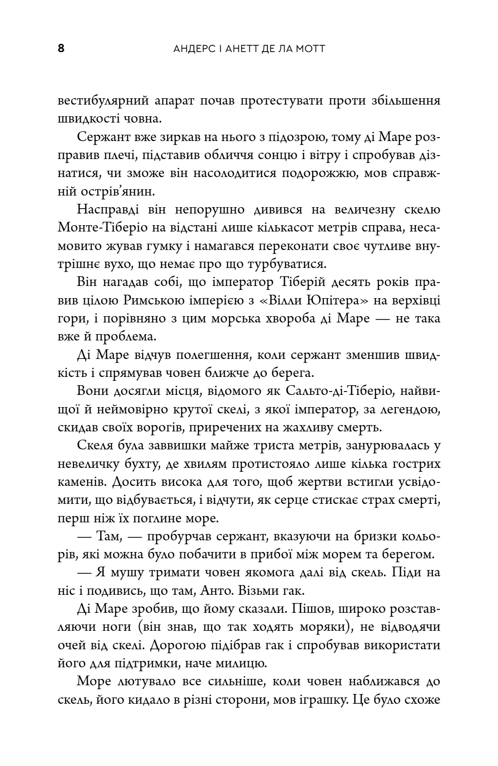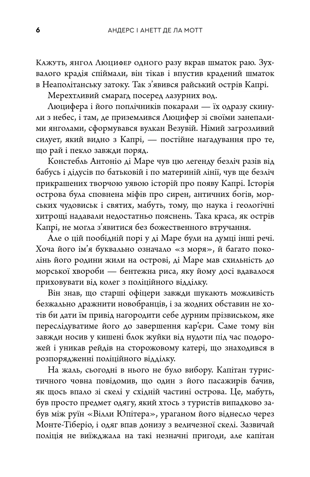 Вбивства під сонцем. Книга 1. Смерть на Капрі від Андерса де ла Мотта та Анетт де ла Мотт — інтригуючий детектив про подорож на Капрі, де відпочинок туристів перетворюється на заплутану справу про вбивство. Головним героєм є вчитель історії Г'юго, який разом із групою інших гостей поринає у вир подій, що загрожують спокою райського острова.