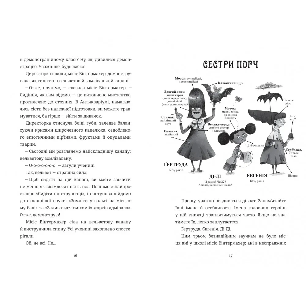 Ніхто в Антикваріумі не мріяв опинитися в руках Міллісент Квібб — загрозливої, страхітливої й легендарної скаженої науковиці. Лише сестрички Порч — Ґертруда, Євгенія та Ді-Ді — наважуються проміняти уроки етикету на небезпечні досліди й польоти на мухоциклі. Вони не лише вчаться дивакуватій науці, а й рятують своє місто від зловісних змовників.