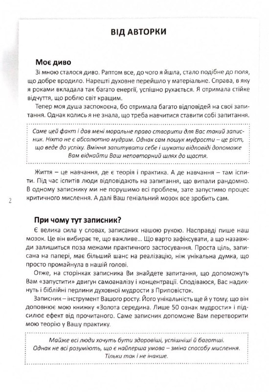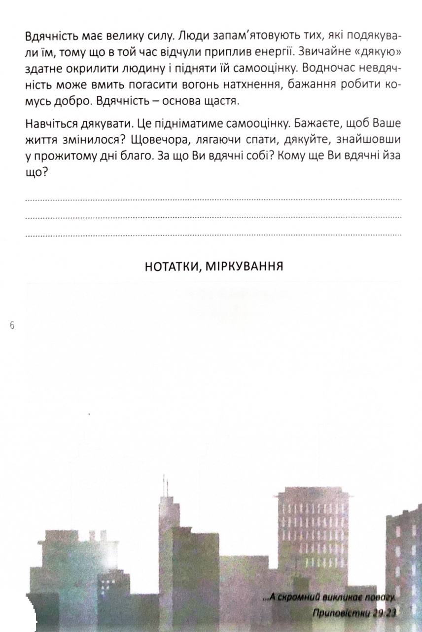 Цей записник заохочує брати відповідальність за власне життя, фіксувати думки, наміри та кроки до змін. Через письмові практики читач спостерігає, як духовна робота над собою знаходить відображення в реальному, матеріальному світі — у справах, виборах і відчутті щастя.