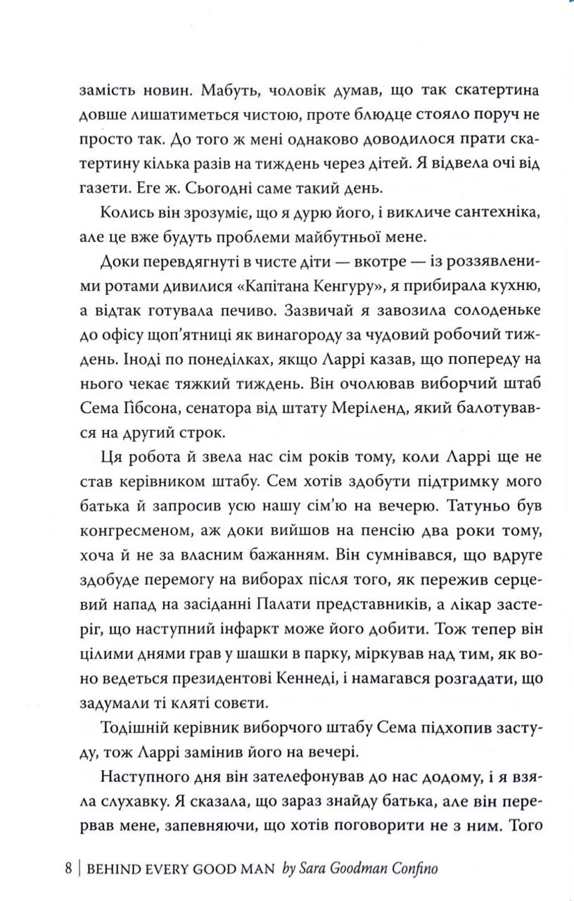 За кожним хорошим чоловіком від Сара Ґудмен Конфіно — захоплива історія домогосподарки Беверлі Даймонд, яка стикається з зрадою чоловіка та відкриває для себе новий світ політики й можливостей, прагнучи реалізувати власні мрії.