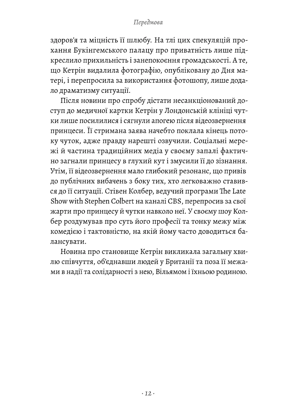 Автор показує, як елегантність, щирість, самоіронія та неймовірна працелюбність Кетрін, разом із підтримкою принца Вільяма, перетворили їхній союз на зразок сучасної королівської родини та підготували її до історичної ролі першої за століття «королеви з простого народу».