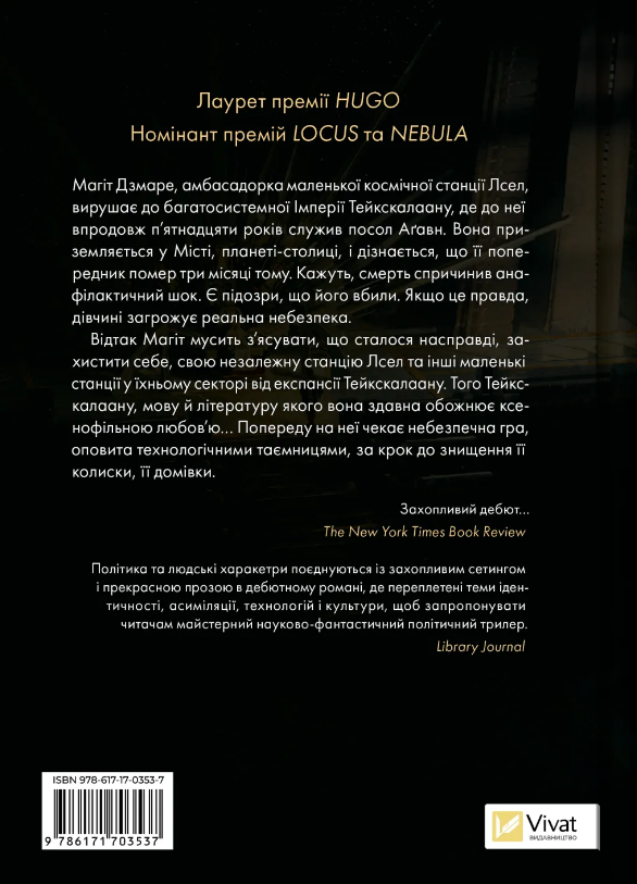 Магіт Дзмаре, амбасадорка маленької космічної станції Лсел, вирушає до багатосистемної Імперії Тейкскалаану, де до неї впродовж п’ятнадцяти років служив посол Аґавн. Вона приземляється у Місті, планеті-столиці, і дізнається, що її попередник помер три місяці тому. Кажуть, смерть спричинив анафілактичний шок. Є підозри, що його вбили. Якщо це правда, дівчині загрожує реальна небезпека.