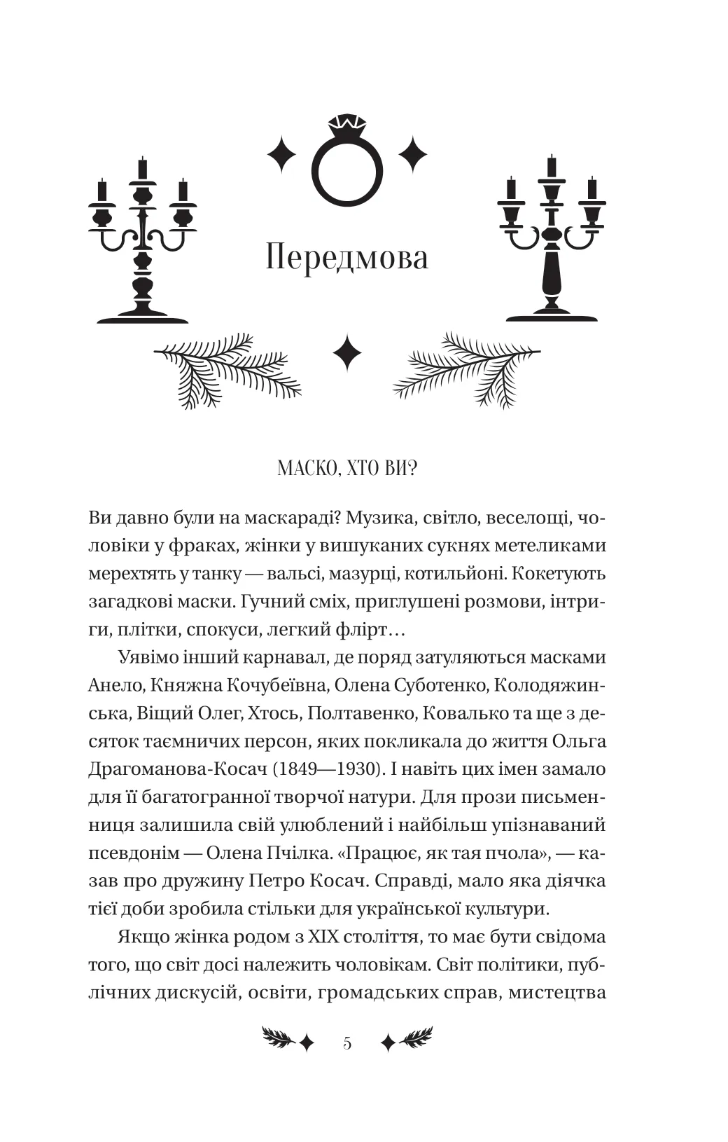 Олена Пчілка насправді Ольга Драгоманова-Косач. Вона мати не лише Лесі Українки, а ще п’ятьох дітей. Ба більше, вона ще й етнографка, редакторка, громадська діячка, вихователька, партнерка, а також дружина, свекруха, теща, бабуся... З цього й починається її маскарад.