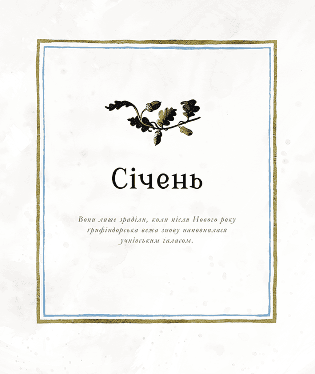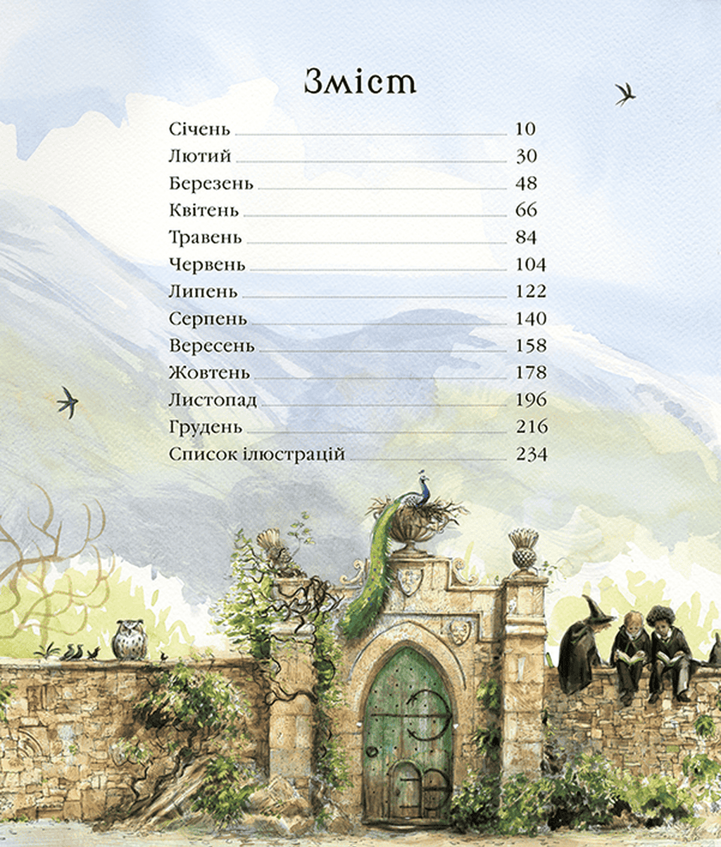 Сторінка за сторінкою читач спостерігає за зміною пір року, святкує визначні дати чарівного світу та знову зустрічає знайомих персонажів. Художні чари Джима Кея, створені за допомогою фарб, олівця та цифрових технік, оживляють магічний рік у школі чарів і чаклунства.