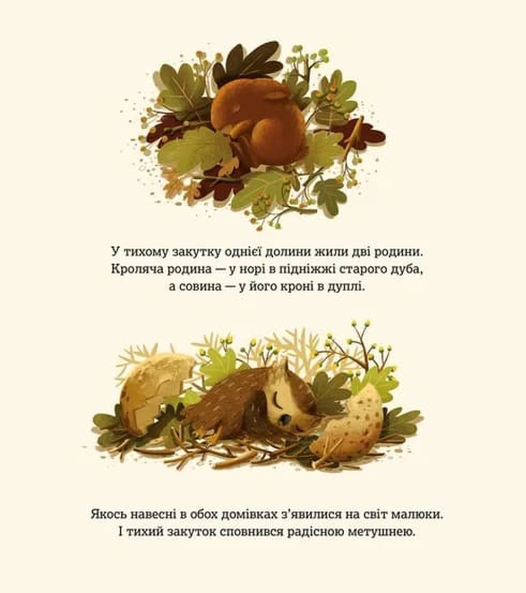 У підніжжі старого могутнього дуба живе кроляча родина, а високо в кроні, в затишному дуплі, мешкає совина сім’я. Хоча вони живуть зовсім поруч, зустрітися їм нелегко. Адже коли кроленя Трусь стрибає серед теплих сонячних трав, маленька сова Сплюшка міцно спить. А коли Сплюшка розправляє крила, щоб політати у сяйві місяця, Трусь якраз засинає.
