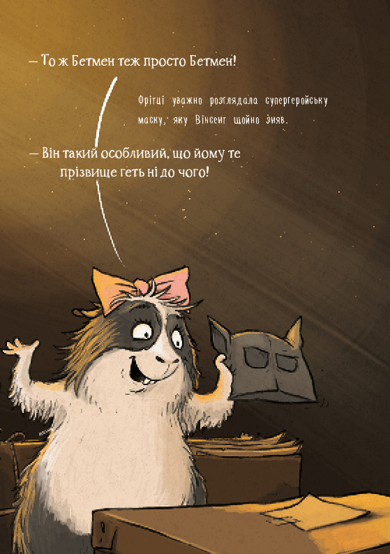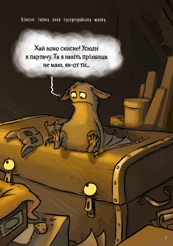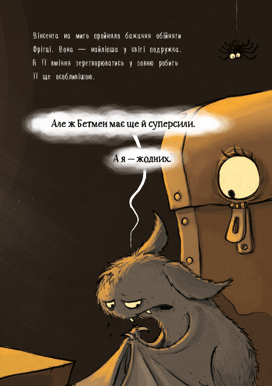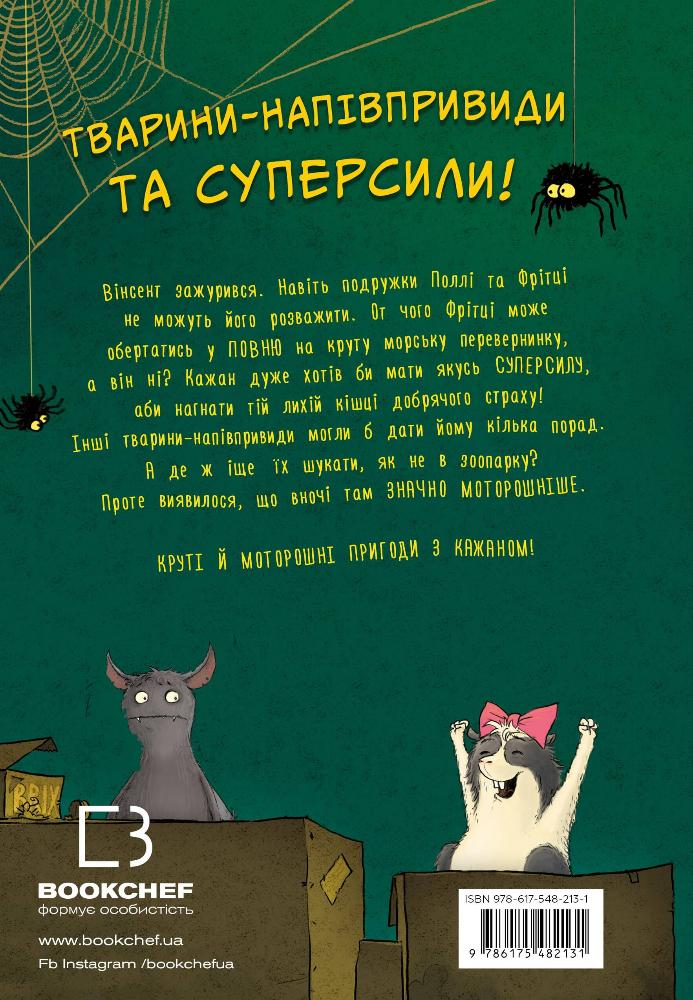 Вінсент зажурився. Навіть подружки Поллі та Фрітці не можуть його розрадилити. От чого Фрітці може обертатись у повню на круту морську перевернинку, а він ні? Кажан дуже хотів би мати якусь СУПЕРСИЛУ, аби нагнати тій лихій кішці добрячого страху! Інші тварини-напівпривиди могли б дати йому кілька порад.