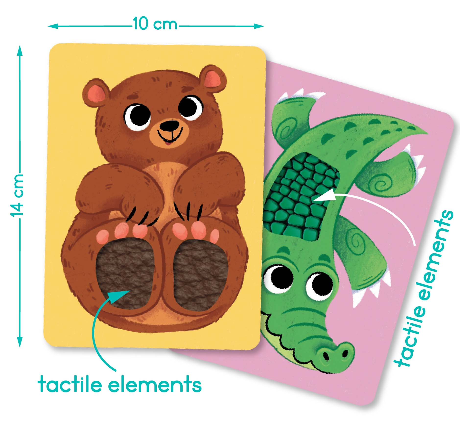 У комплекті — 10 великих тактильних карток розміром 14×10 см. Кожна картка має спеціальні текстури, що стимулюють сенсорний розвиток, покращують дрібну моторику та формують тактильну чутливість. Під час гри малюки навчаються впізнавати тварин, асоціювати їх із відповідними фактурами та розширювати словниковий запас.