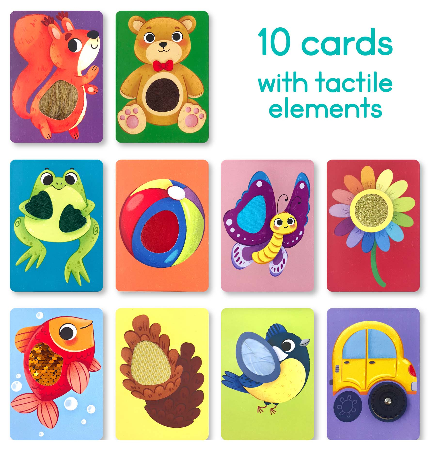 У комплекті — 10 великих тактильних карток розміром 14×10 см. Кожна має унікальні текстури, які стимулюють сенсорний розвиток дитини, тренують дрібну моторику та формують тактильну чутливість. Малюки вивчають об’єкти, які можна зустріти під час прогулянки, та розширюють словниковий запас у цікавій ігровій формі.