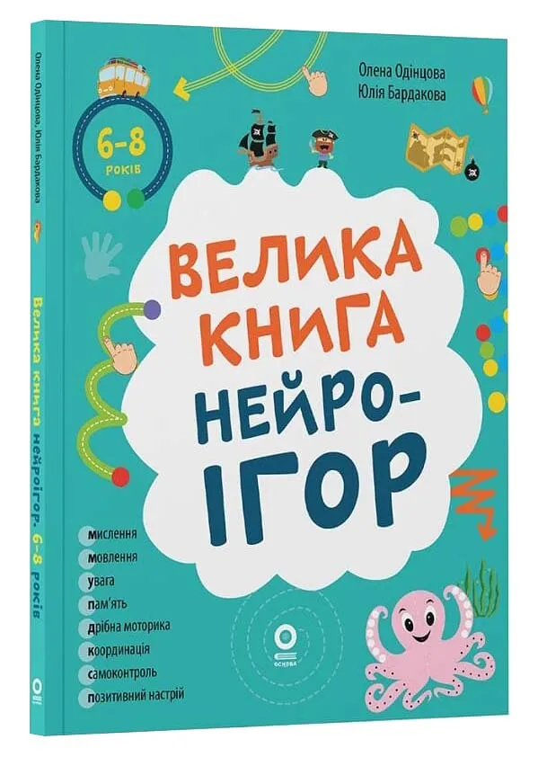 Велика книга нейроігор. 6–8 років — захопливе видання з 40+ нейроігор, створених спеціально для дітей молодшого шкільного віку. Завдання подаються через інструкції та підказки від розумних нейрончиків Юджина й Олівії.