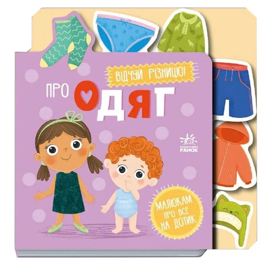 Малюкам про все на дотик. Про одяг — унікальна тактильна книжка, яка допомагає дитині познайомитися з одягом у різні пори року та для різних занять через дотик. Завдяки спеціальним вставкам малюк може відчути фактуру тканин і водночас розвивати сенсорне сприйняття та дрібну моторику.