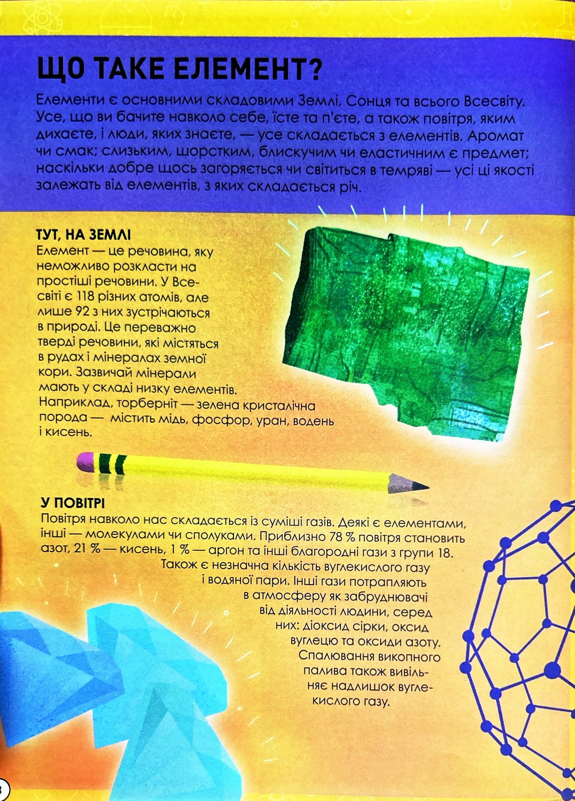 На сторінках книжки зібрано факти про хімічні елементи, їхні властивості, відкриття та вплив на повсякденне життя. Читач дізнається про історію створення періодичної системи, як вона змінила наукові уявлення про світ, а також ознайомиться з основними поняттями хімії у зрозумілій і захопливій формі.