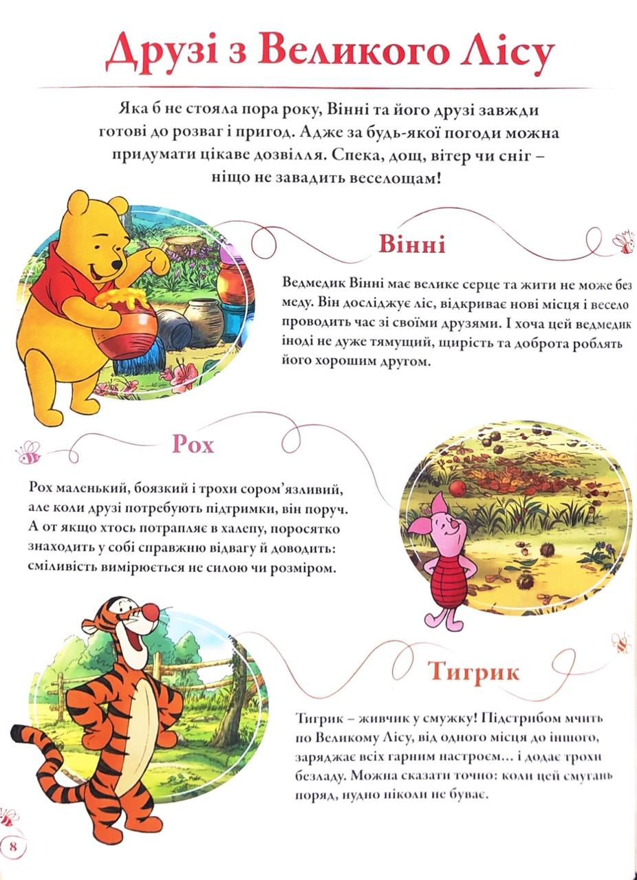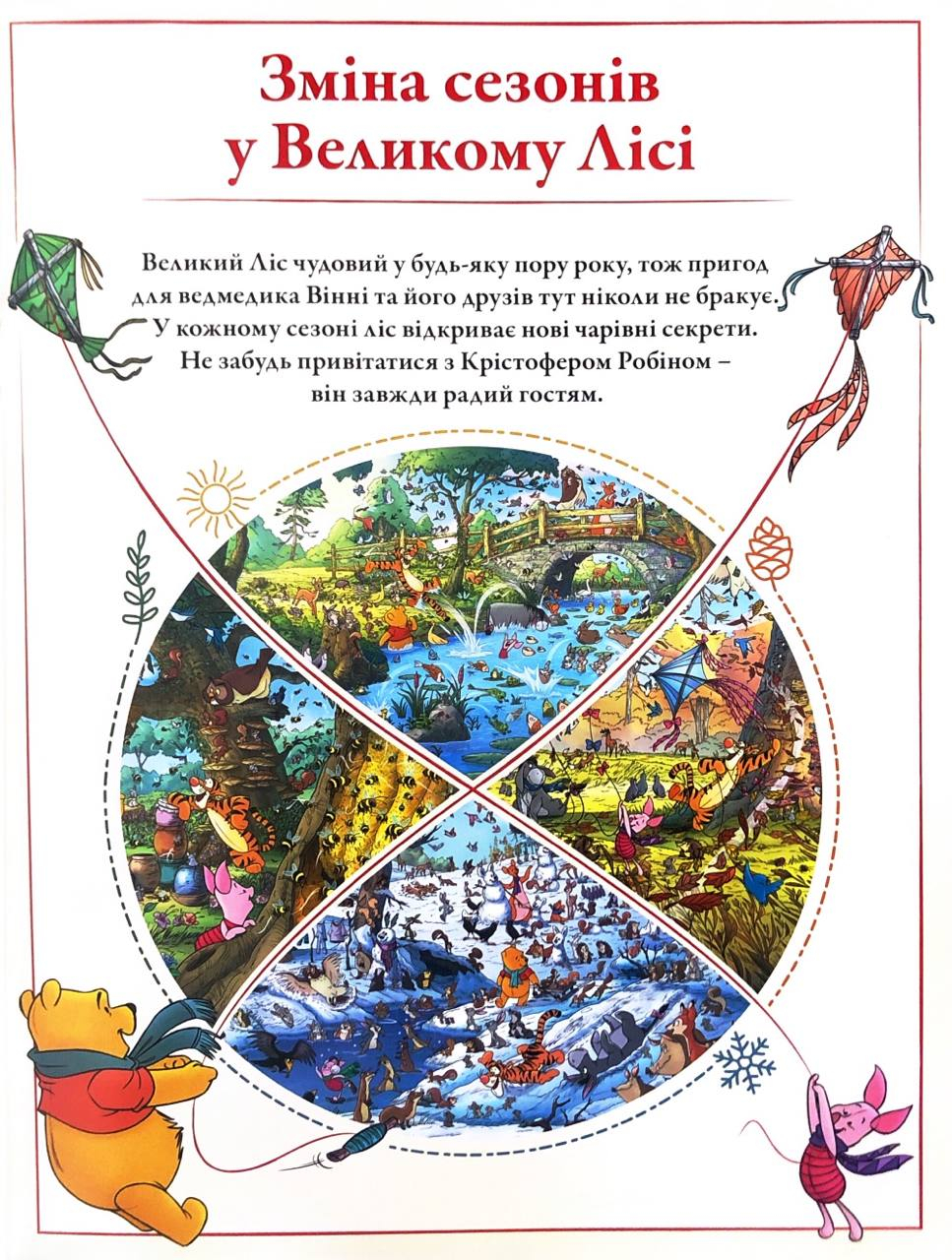 У Великому Лісі змінюються сезони, а разом із ними — і пригоди. Вінні та його друзі досліджують знайомі стежки, милуються лісом і помічають дрібниці, які роблять кожен день чарівним. Читача чекає не лише читання, а й активна участь: потрібно розглядати малюнки, відмічати знахідки та виконувати завдання.