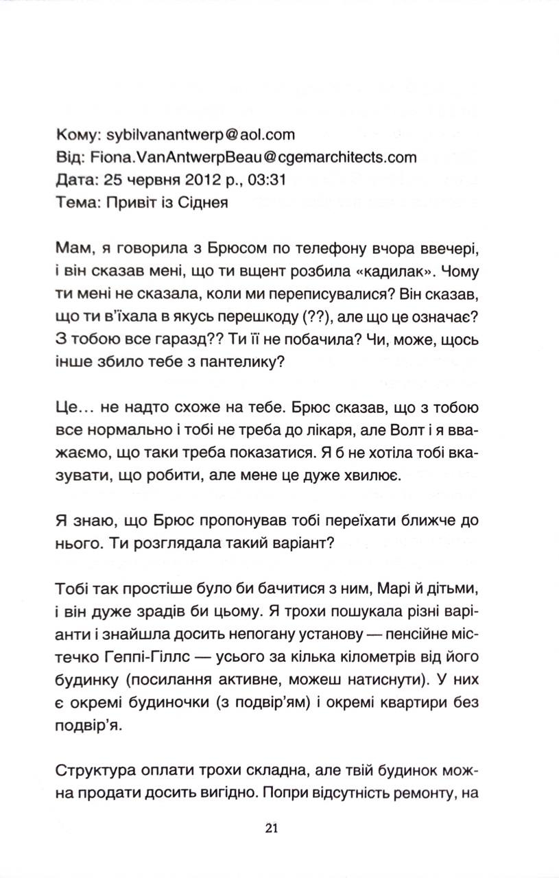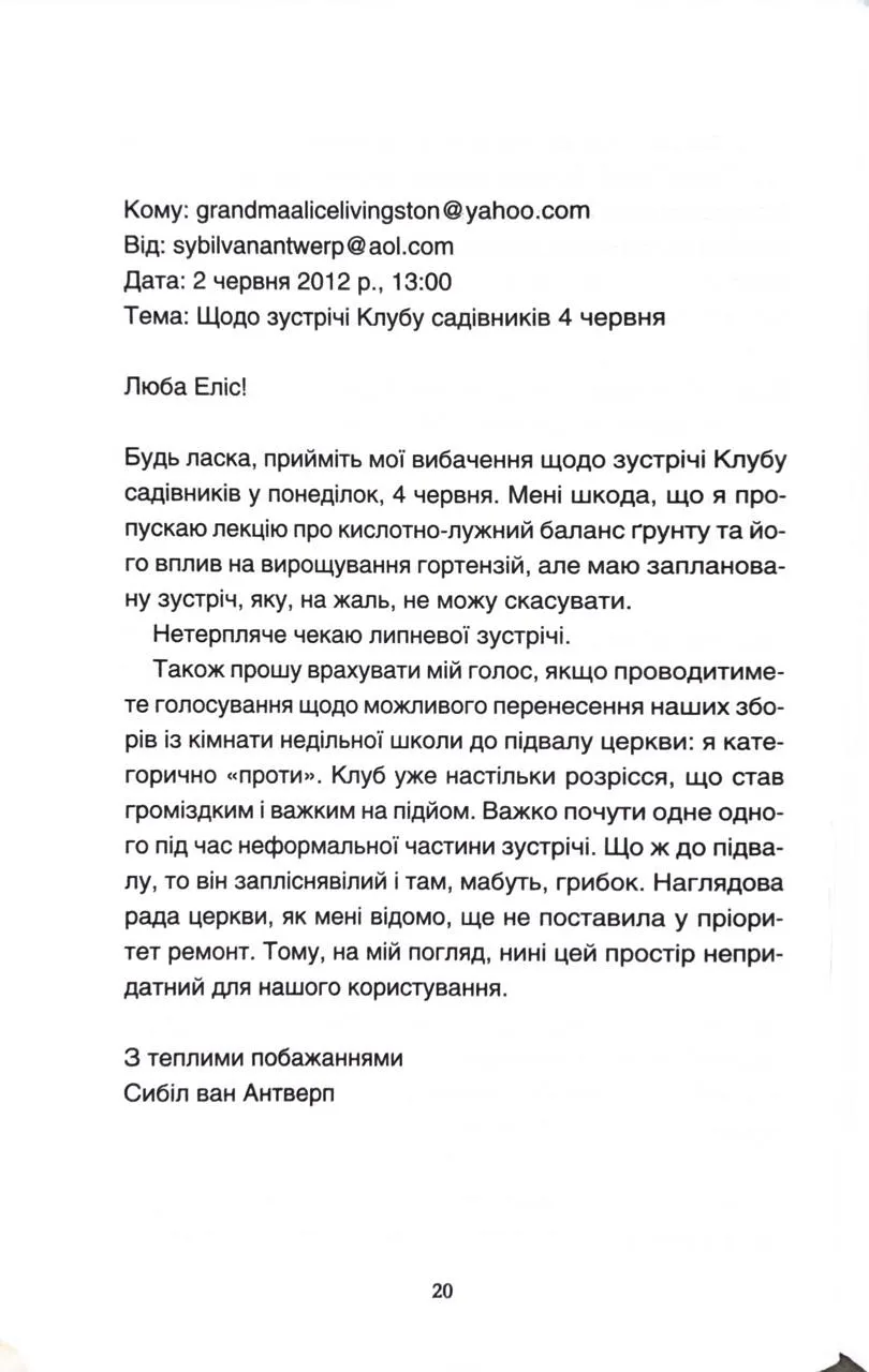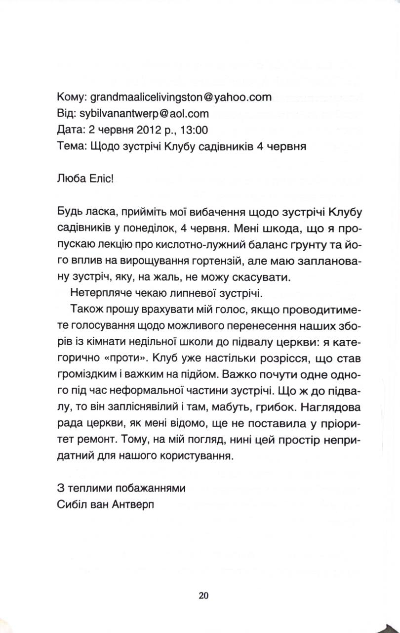 Сибіл ван Антверп — колись успішна юристка, а зараз сімдесятирічна розлучена жінка. З моменту виходу на пенсію Сибіл невтомно пише листи: братові, подрузі, знайомому, сусіду, представнику служби підтримки клієнтів, письменникам, чиї книжки прочитала, — будь-кому і всім.