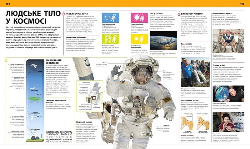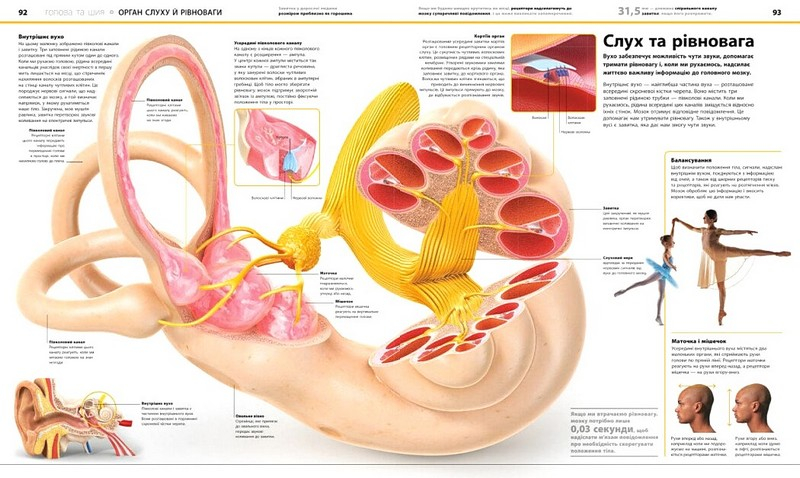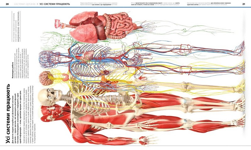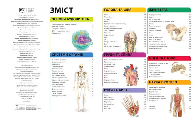 Яскрава енциклопедія ідеально балансує між інформаційними та візуальними складниками, роблячи матеріал цікавим для вивчення. Книга поділена на логічні розділи, що базуються на частинах тіла, а також на блоки про те, з чого складається людський організм та як працюють його системи.