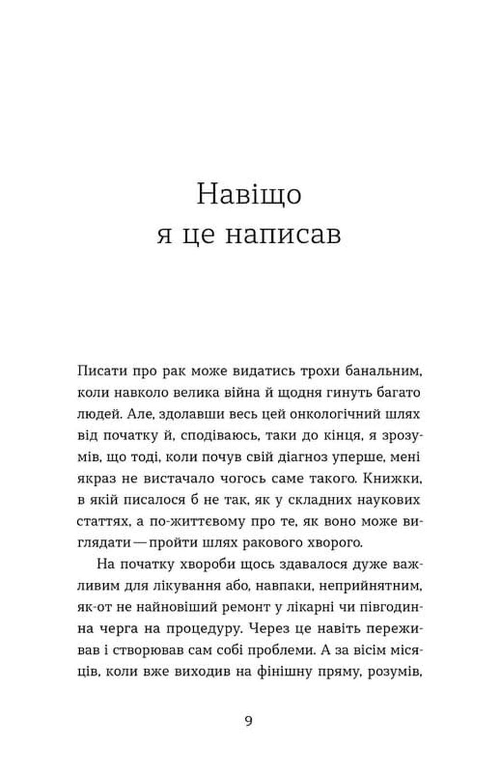 Що робити, коли твоє життя вмить змінюється з діагнозом, і як узагалі лікуватися, коли ракетний обстріл у будь-який момент може перервати процедуру? Автор щиро розповідає про кожен етап боротьби, ділиться практичними лайфхаками, жартує та пояснює, як правильно підтримувати близьких, що стикнулися з онкологією.