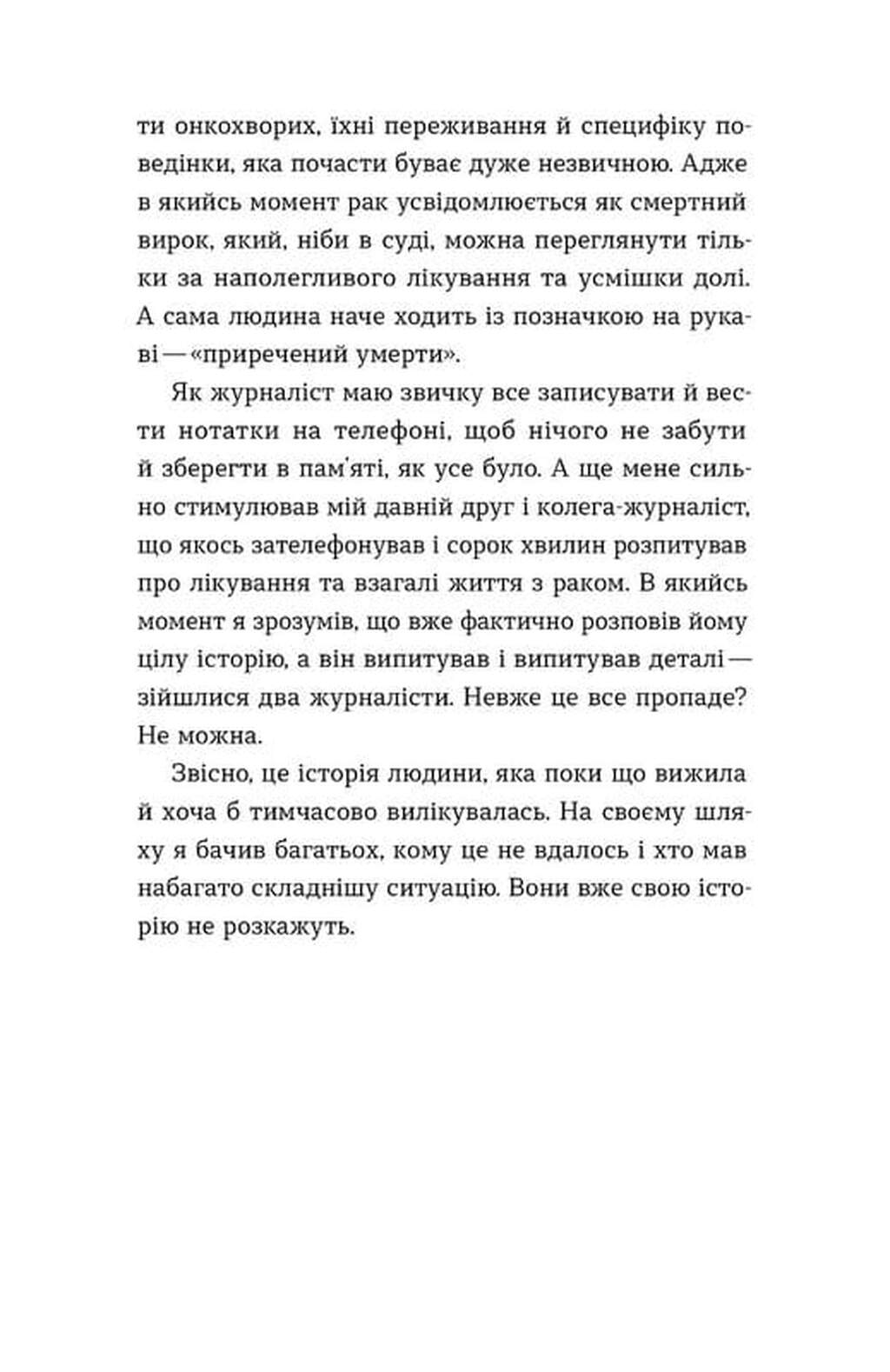 Це історія, яку вам міг би розповісти приятель у барі, колега за чашкою кави на офісній кухні чи сусідка в потязі. Віталій — журналіст, який захворів на лімфому Ходжкіна, пройшов виснажливу терапію та вийшов у ремісію. Попри всі страхи, до своєї хвороби він поставився як професіонал — занотовував власні відчуття й історії, з якими стикався в процесі лікування, робив записи безпосередньо в лікарняних палатах.
